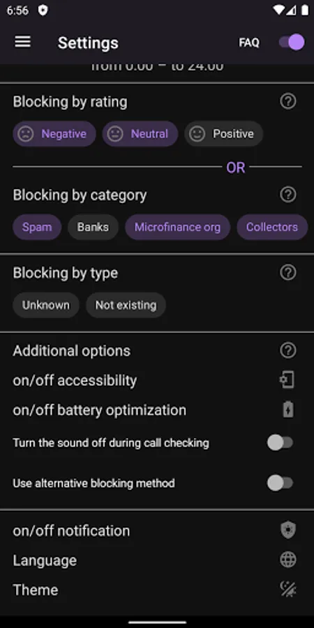- Blocking by time, rating and category: banks, MFOs, collectors, spam.