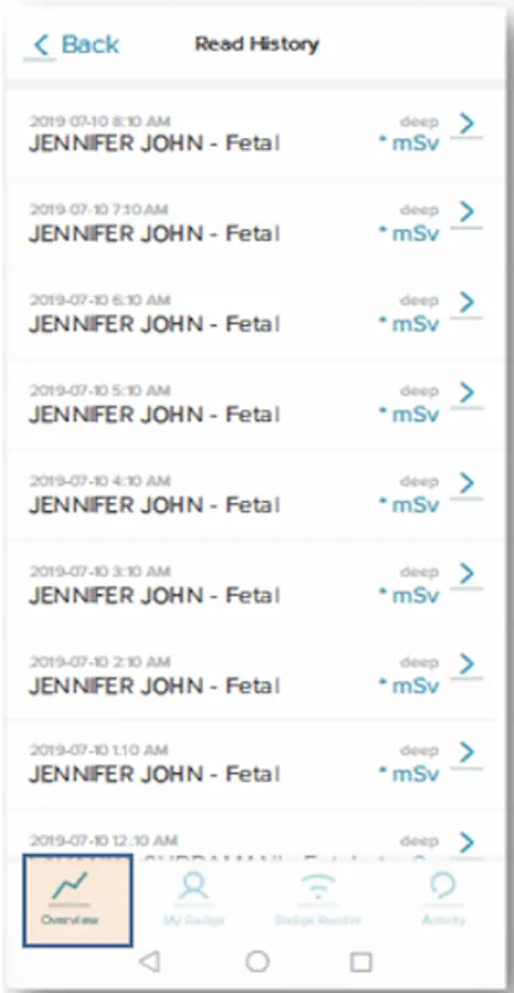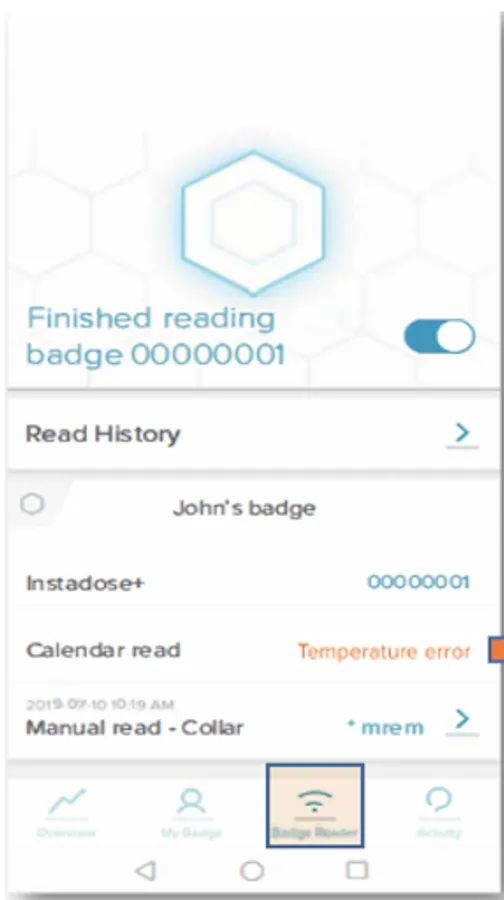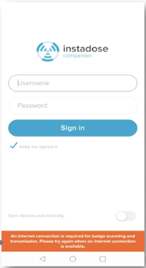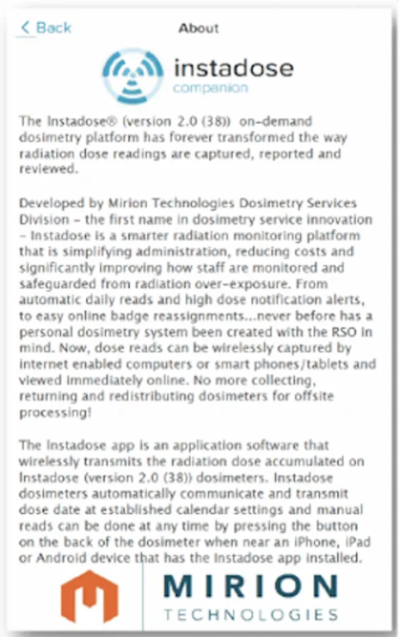 The Instadose® Companion mobile app wirelessly communicates and securely transmits accumulated dose data from Instadose®+ and Instadose®2 digital dosimeters to Mirion servers where dose information is archived in the wearer’s legal dose of record. Automatic dose reads are performed on an established calendar setting (set by your account administrator) and manual dose reads can be performed at any time by pressing the button on the back of the dosimeter for 4-seconds. Successful transmission occurs when the dosimeter is in range of the mobile device with the Instadose app opened and “searching for devices” appears on the main screen. Dose results, history, and wearer/dosimeter information can be immediately viewed (by the individual wearer or admin only) directly on the app after a successful transmission.