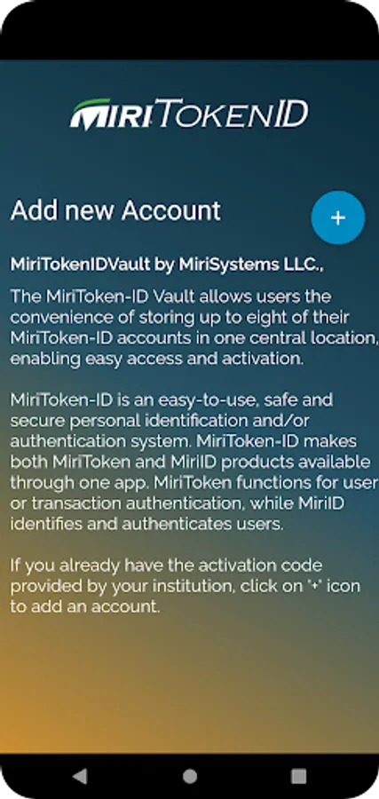 MiriToken-ID is an easy-to-use, safe and secure personal identification and/or authentication system. MiriToken functions for user or transaction authentication, while MiriID identifies and authenticates users. MiriToken-ID makes both MiriToken and MiriID products available through one app.