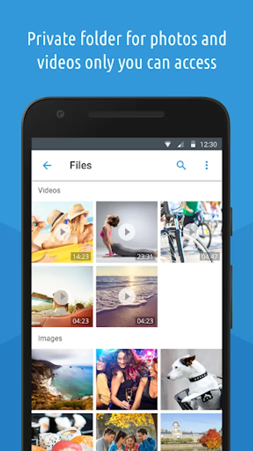 - Play your files offline with the in-app video player and photo viewer