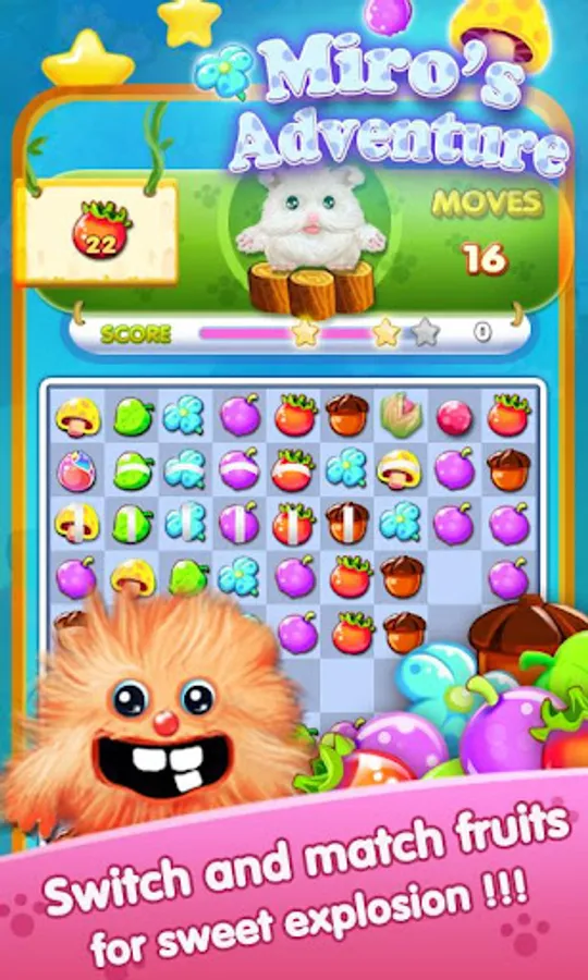 The cute pet named Miro lives in the forest happily. However there are some unfriendly creature. Fortunately it has friends to experience this. Collect delicious fruit and vegetables. Let us explore this funny and magic world with pet Miro.Forest fruit mania match 3 game awaits you with its stunning graphics and addictive fruit match 3 free game play!