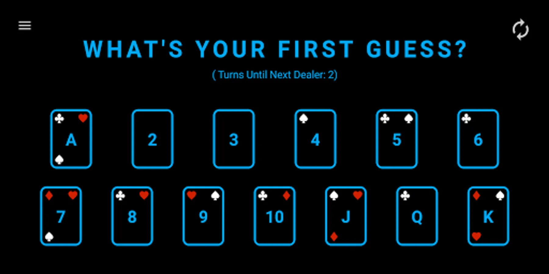 - the player to the left of the "dealer" gets two guesses as to what the top card is