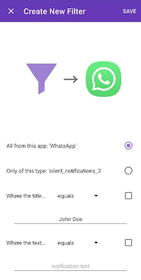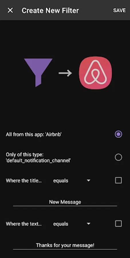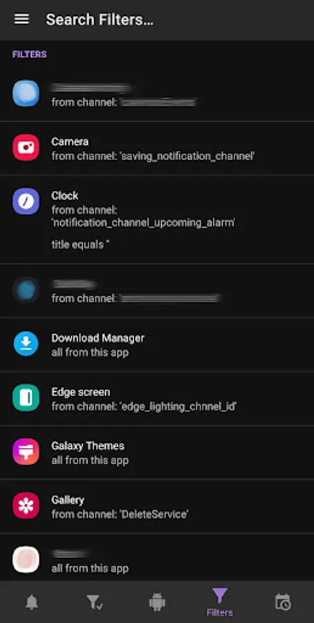 Hide all notifications from the app, ones only from a specific channel, or create a custom one that filters by the notification's title or text. These will now appear on the "Filtered" page going forward.