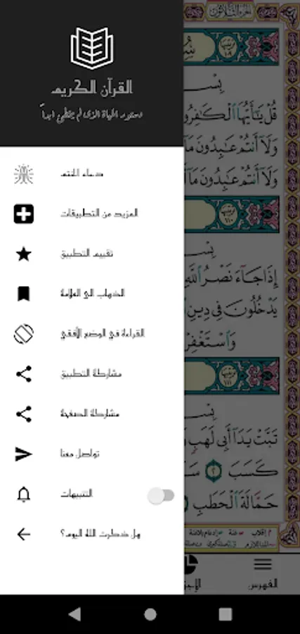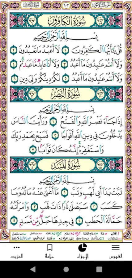 The Holy Qur’an is complete without an Internet connection, and it is completely identical to the paper Qur’an, in addition to the search feature, the seal prayer, the ability to put a mark, the index of the fence, the index of parts and parties, and the ability to move to any page. Nightly, and in the event that the program is closed at a specific page and opened again, it will automatically go to the page at which it was closed, in addition to the ability to read in horizontal and vertical positions, in a clear font, and the background color of the pages is comfortable for the eye