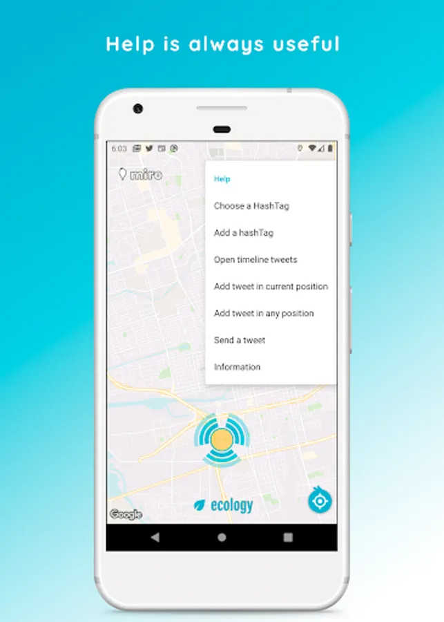 Application developed with Twitter and Google Maps technology to notify authorities or people interested in certain topics by uploading georeferenced images to display in a map or in a tweet timeline.