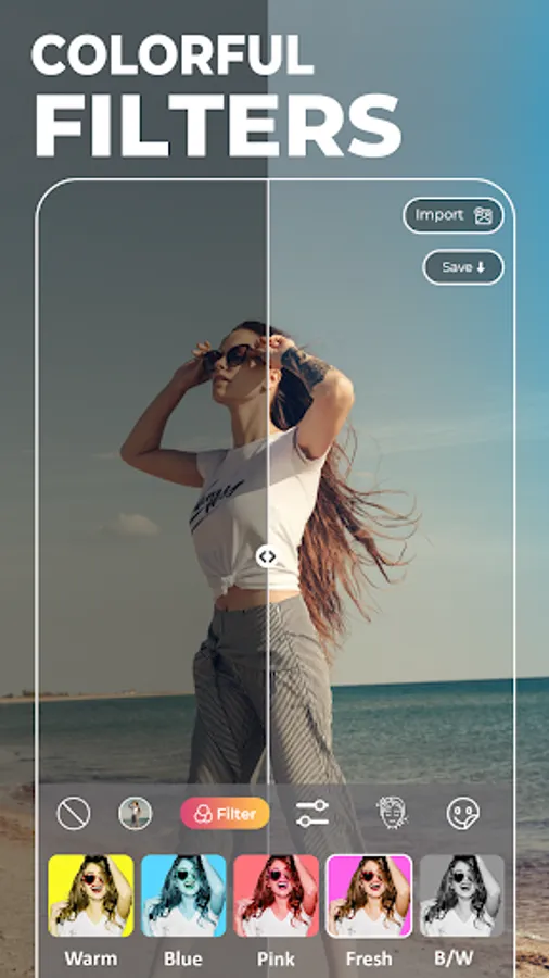2. Easily Crop or Adjust the ratio of the, Apply light effects, Camera filters, Pic sart, and Face tune filters.
