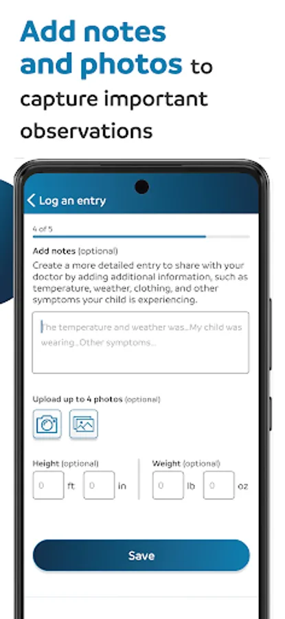 • Growth data: Keep an up-to-date growth percentile chart by logging your child’s height and weight measurements every 30 days