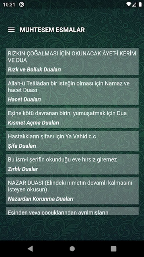 Praying in the names of Allah, the Most Gracious and Merciful, has great virtues. Whoever wishes for his needs using His names, the probability of being accepted increases. We offer you tried prayers. Surah A'raf - 180 : "The most beautiful names (Asma'ül Hüsna) belong to Allah (CC). So pray to Him (CC) with those beautiful names. Let go of the crooked about His (CC) names. They will be punished for what they have been doing.” and another proof is stated in a hadith-i sharif: "Allah has ninety-nine names. Whoever memorizes those names (counts them, understands their meaning and becomes conscious) will go to Paradise.” Bukhari