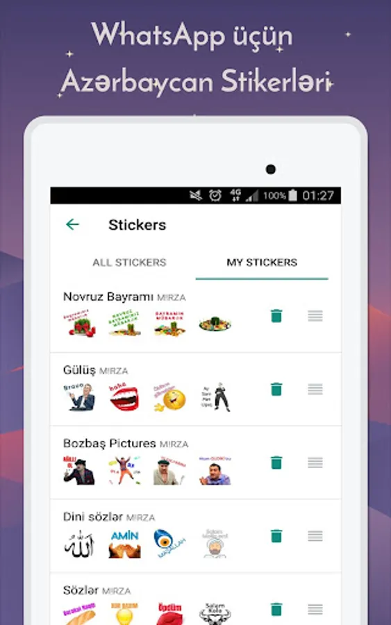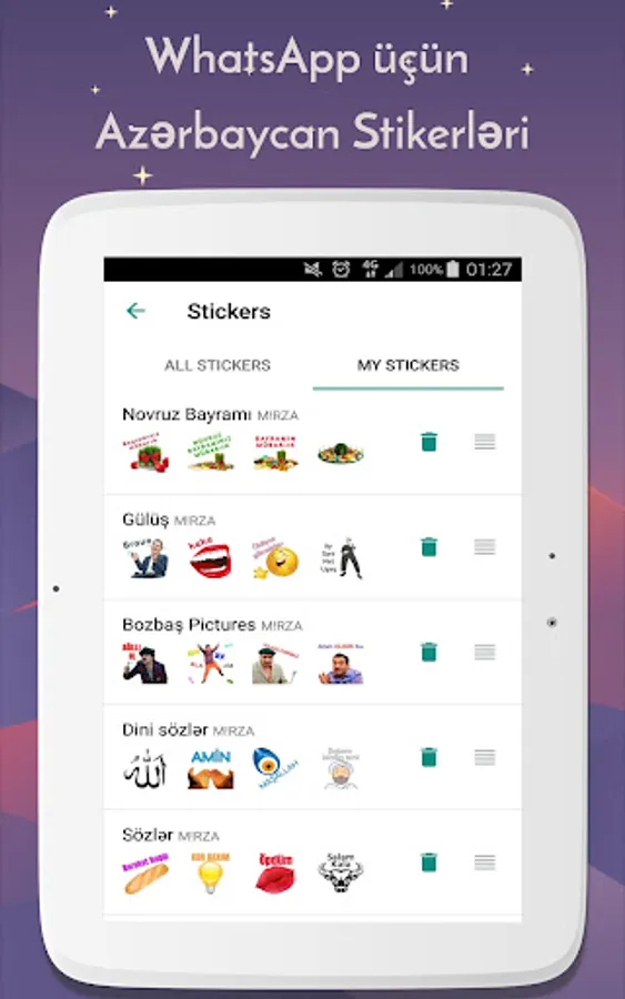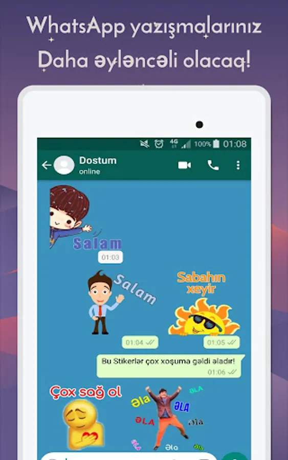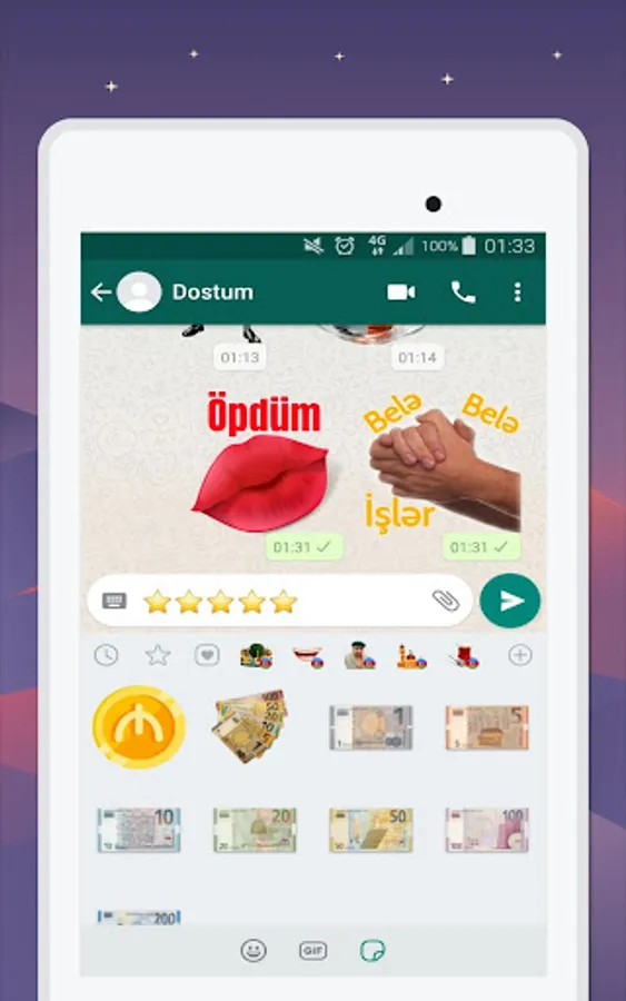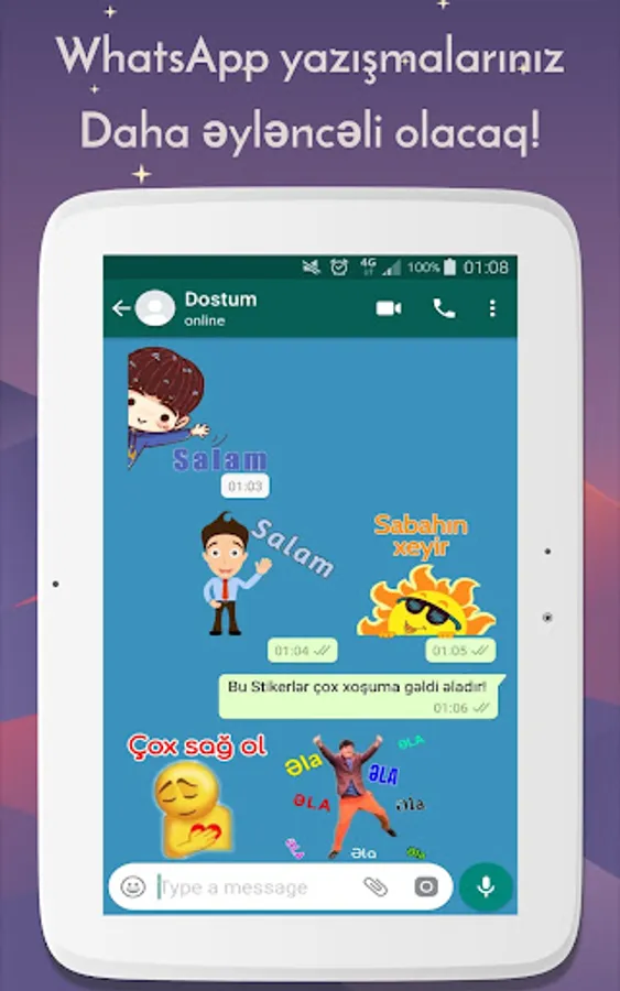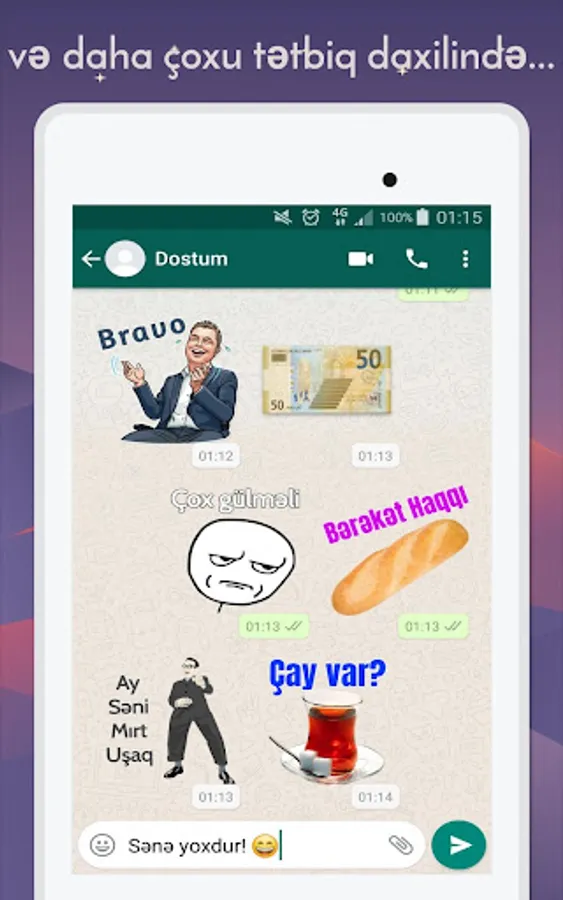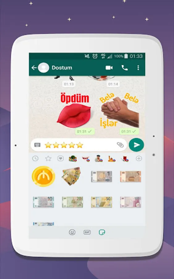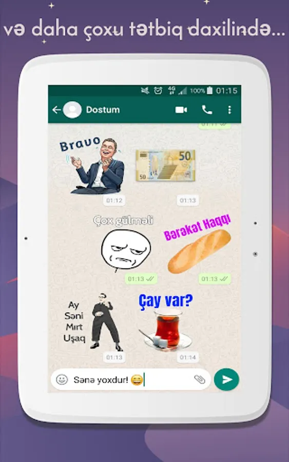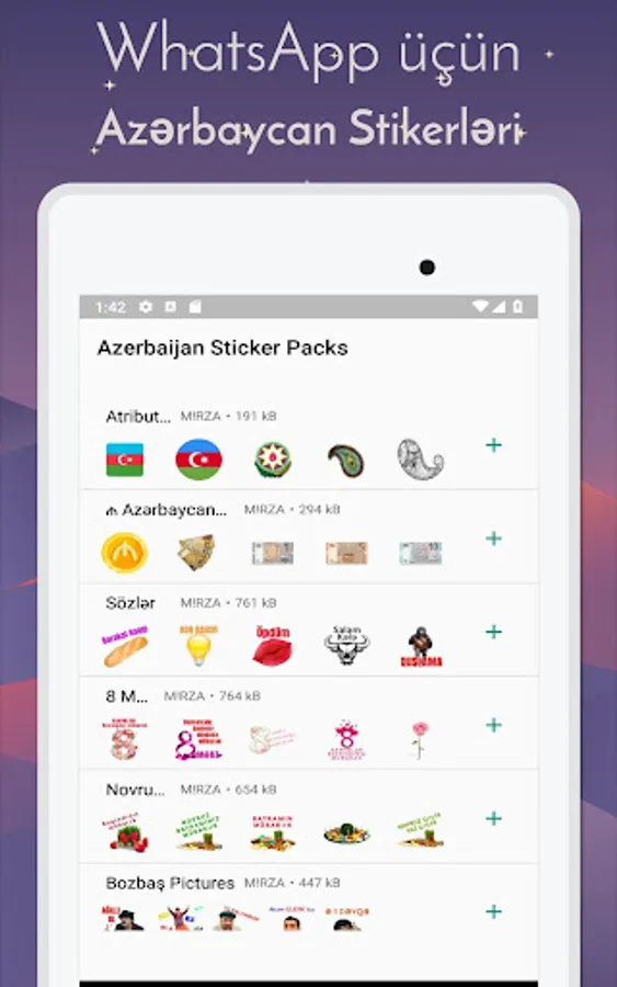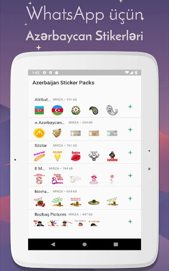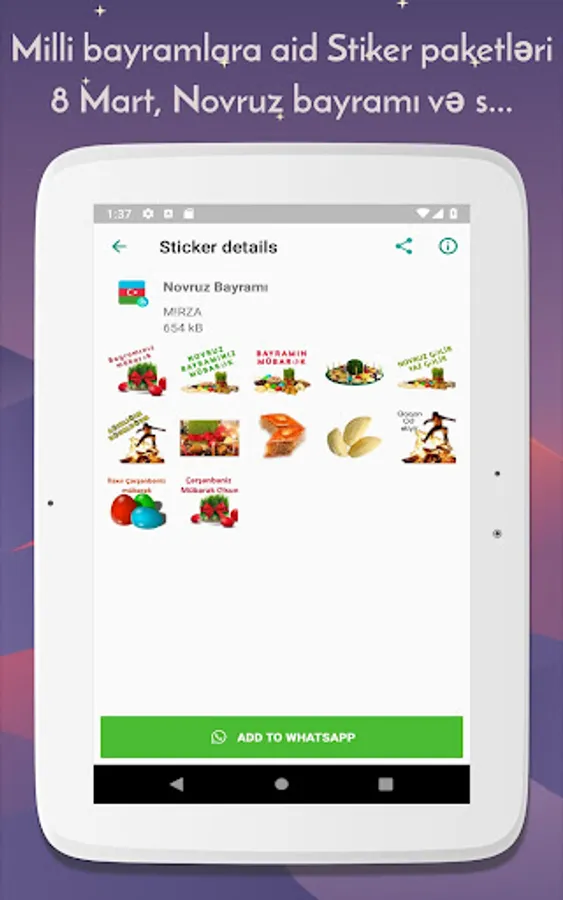 Our application has hundreds of sticker packages for New Year, Novruz holiday (Charshanbas), Eid al-Adha, Ramadan and other holidays and special days.
