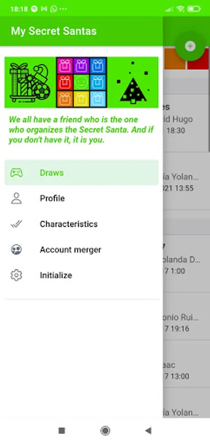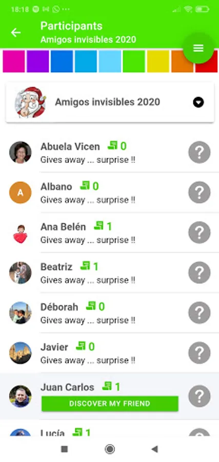 If the draw is invisible, only the list of participants will appear, without revealing the pairings. In this case, a green button will appear below your name with the text DISCOVER MY FRIEND, which when pressed, will indicate the person to whom you have to give a gift.