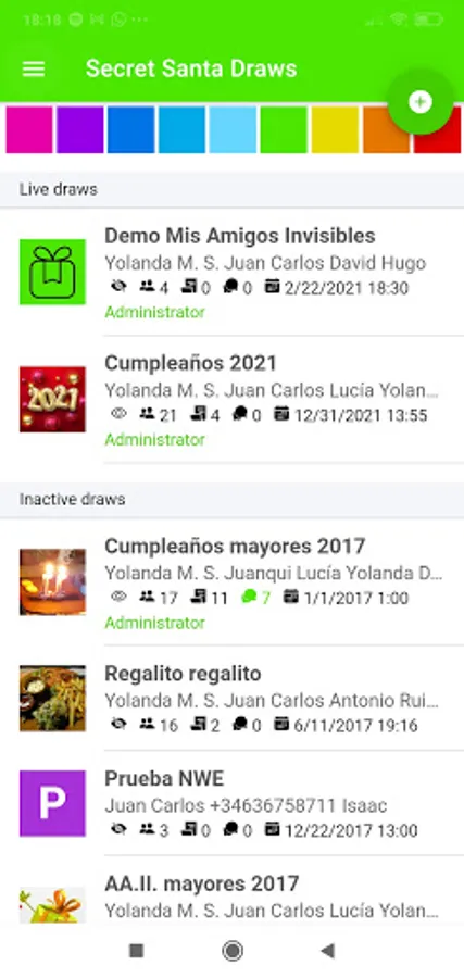 It has random draws, re-draws, exclusions between participants, wish list, chat with your invisible friend, you can define an alias and an avatar in each draw or use the one from your profile, you can indicate the date of delivery of gifts as well as general data as maximum amount, delivery time, etc. You can also clone previous draws to avoid having to re-register participants. Both registered and unregistered people such as children or elderly people who do not have email or mobile phone can participate.