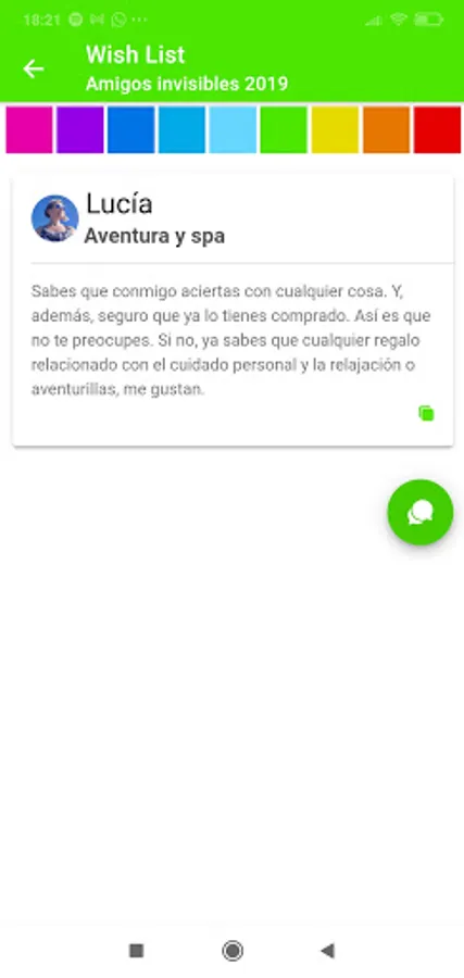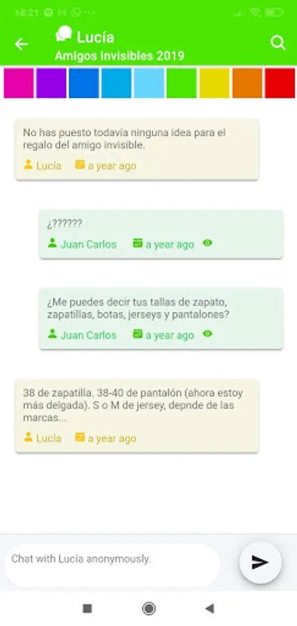 You can also chat anonymously with your invisible friend or with the person to whom you have had to give. Very useful to ask for example clothing size, shoe size, preferences, etc. The exchange of messages is anonymous, except in visible draws, where all participants see the matches generated.