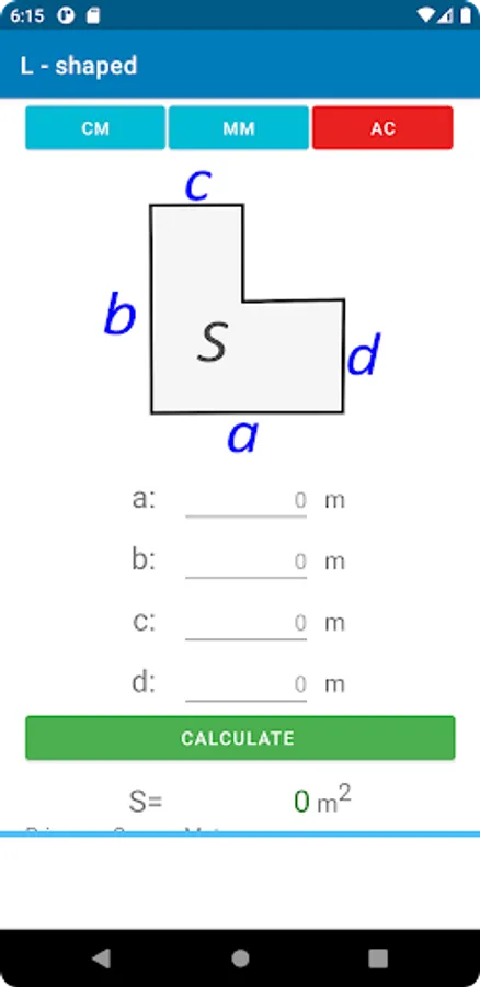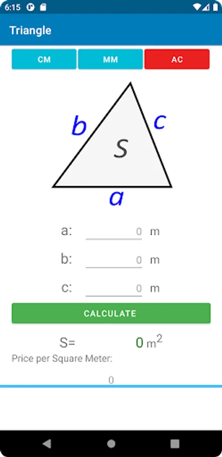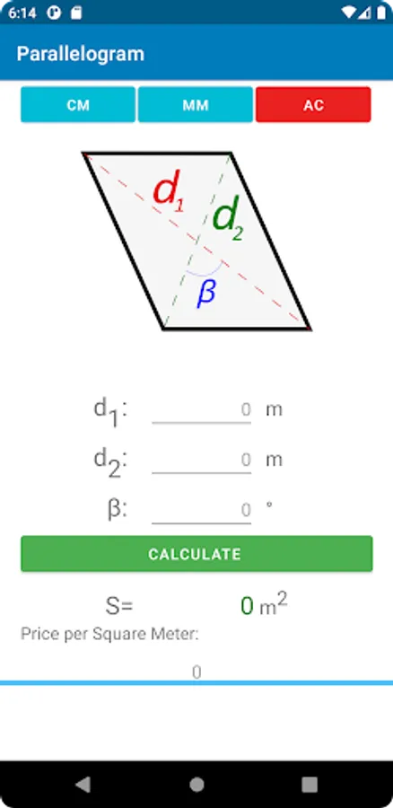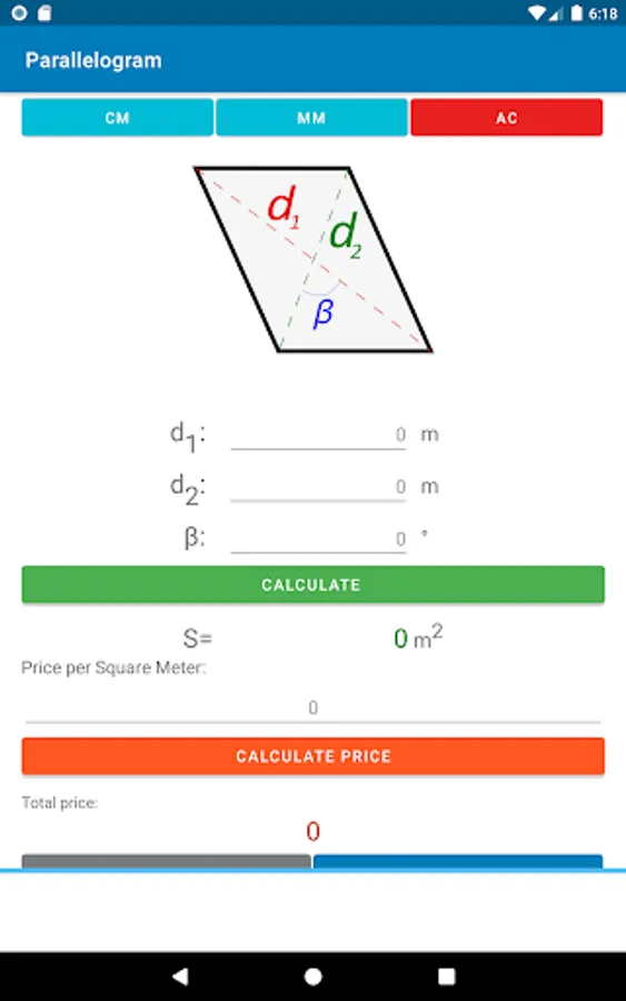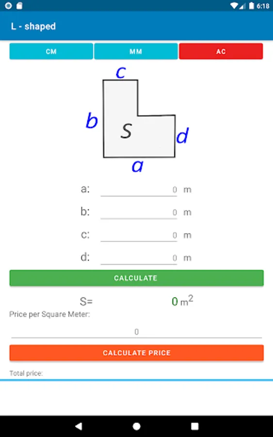 Application for calculating square meters, as well as calculating the total price of a given area.