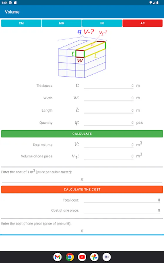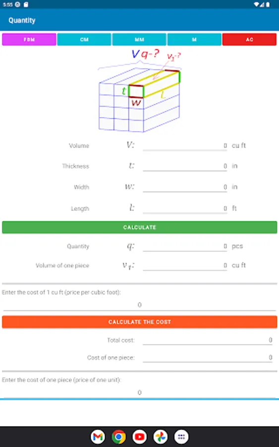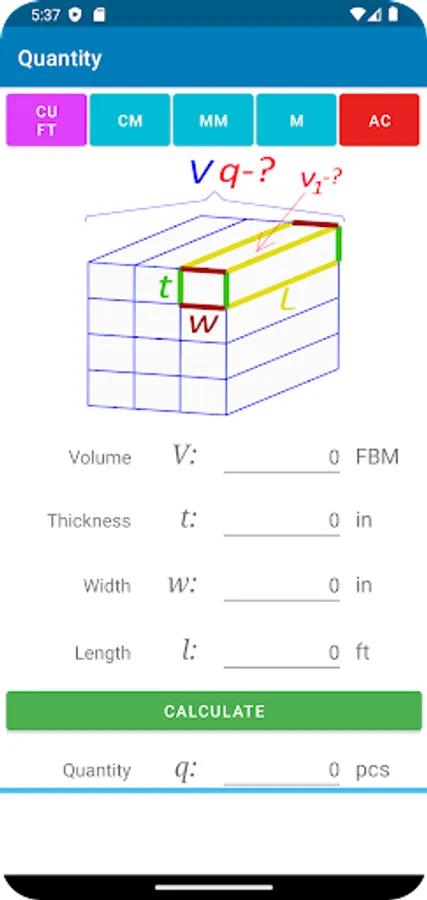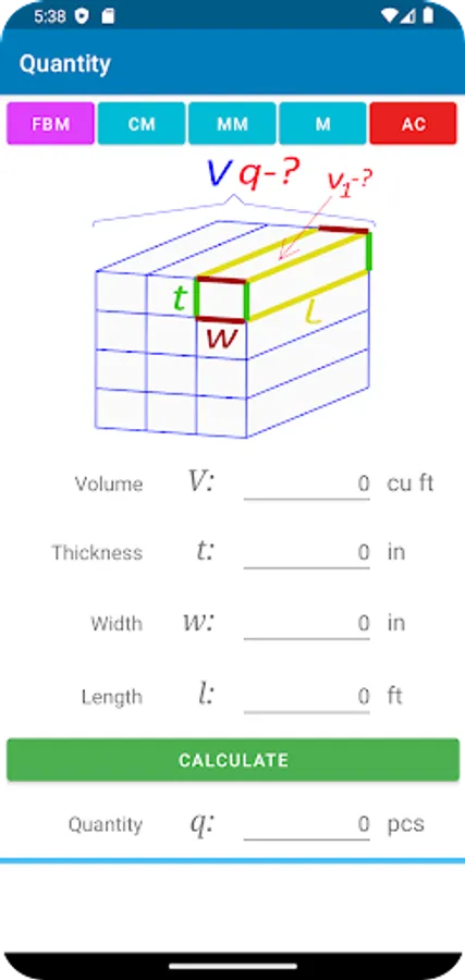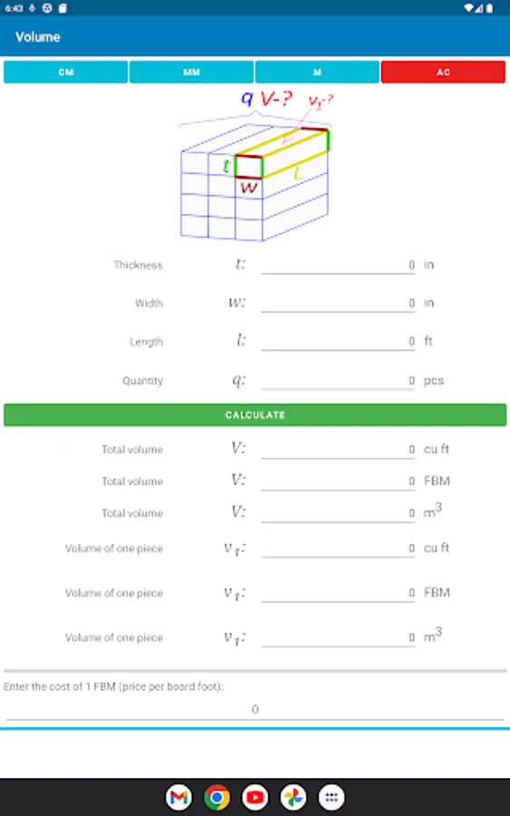 Lumber volume: cubic meters (m3), cubic feet (ft3), board foot (FBM)