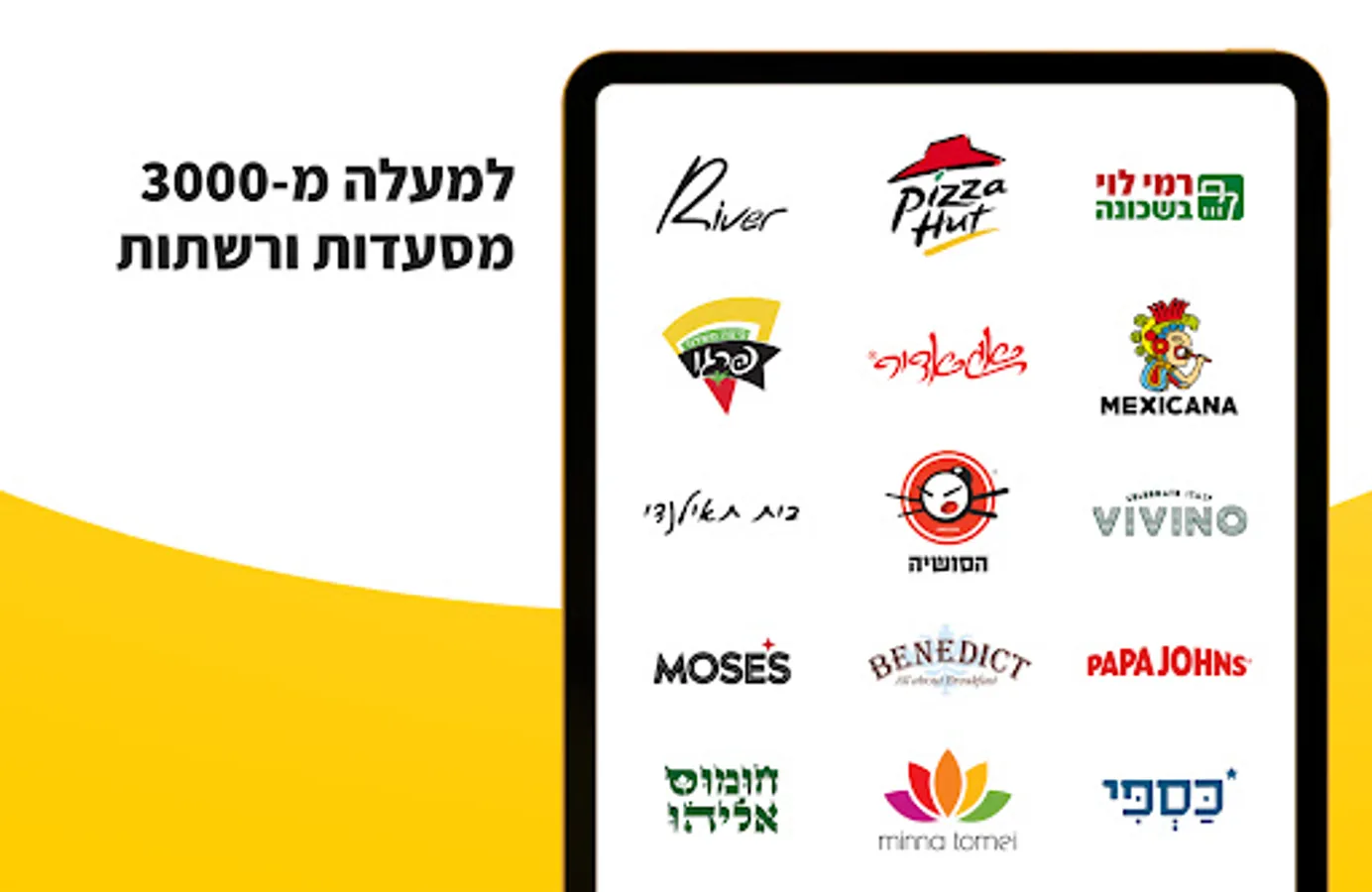 • בחרו מאכלים וסוגי אוכל המועדפים עליכם מתוך מבחר ענק של תפריטי מסעדות באזורכם: פיצות, המבורגר, סושי, סיני, הודי, תאילנדי, מוקפץ, פסטה, שניצל, מרק, סלטים, נודלס, קפה, גלידות, סנדביץ', ג'חנון, טבעוני, חומוס, פלאפל, שווארמה ועוד