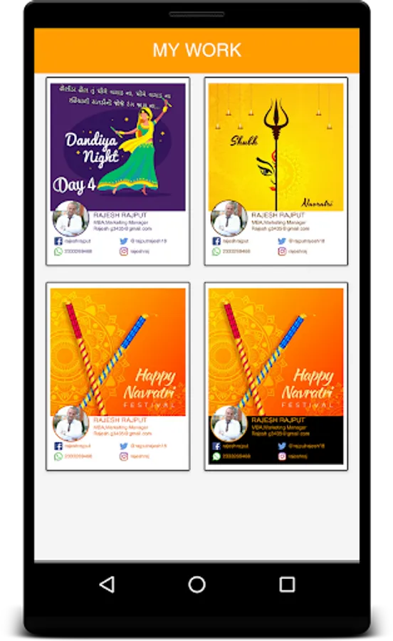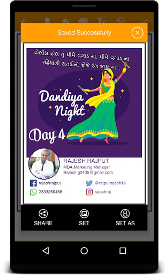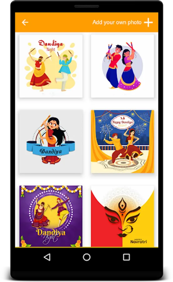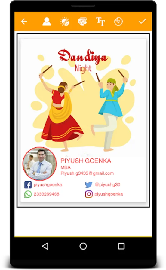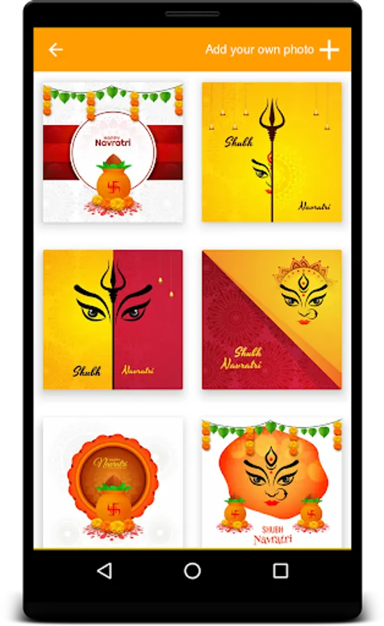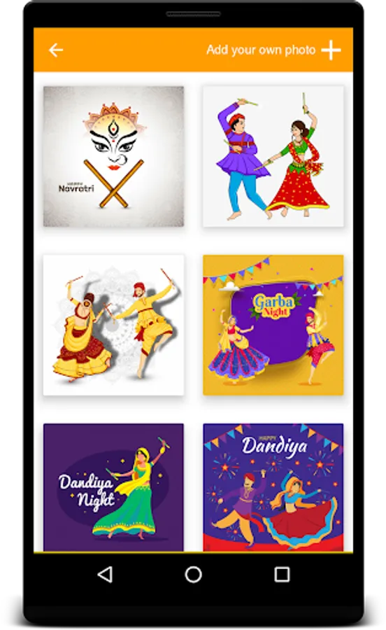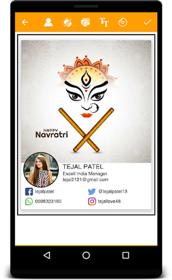 Navratri photo frame is a simple app to use. Just add your profile information and photo then select your navratri photo and save it.