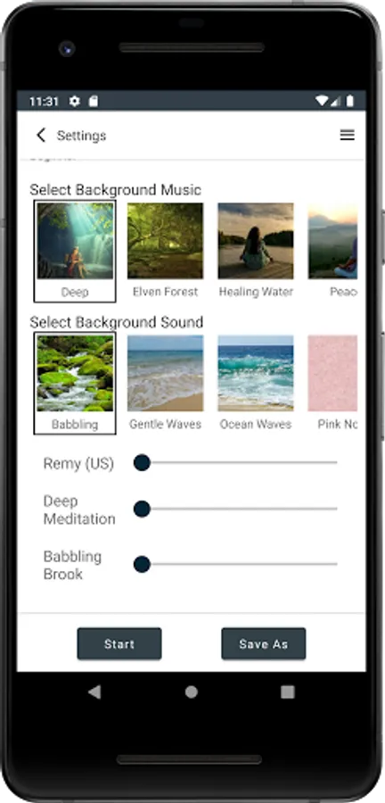 You can choose from 10 voices, 6 background songs, and 6 background sounds. You can customize the muscles in the session, tense and release times, and the amount of talking.