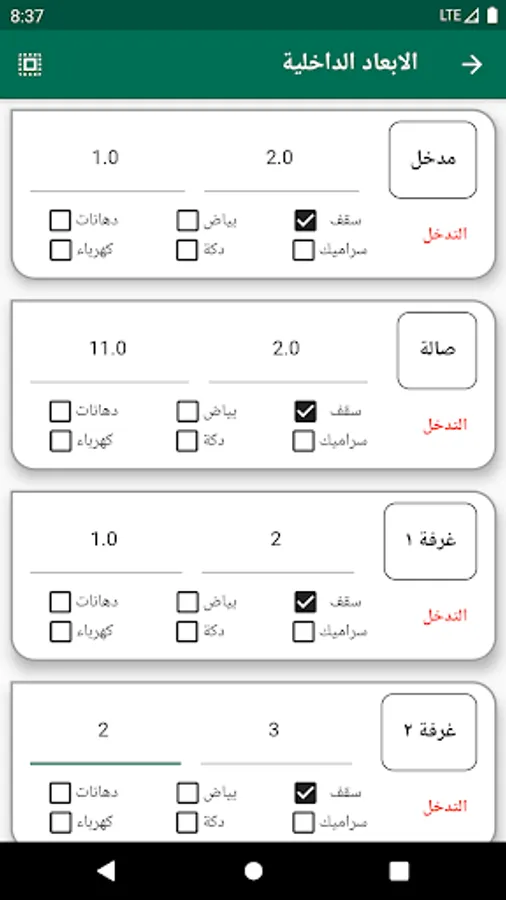 الرجاء مراجعة البيانات المدخله قبل الارسال مثل سمك الحوائط والارتفاع الداخلي لتجنب حدوث اخطاء بحصر الكميات