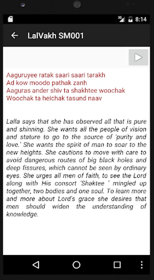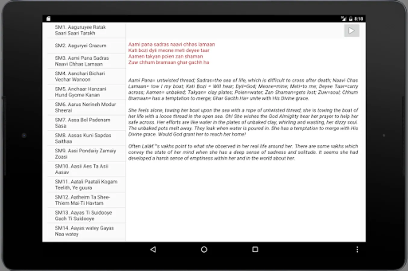 This app on Lal Ded has been constructed by the process of restructuring a lot of literature books and other source material. Care has been taken not to violate the spirit of the original vakh and its meaning. Her vakhs or poetry has been translated widely by eminent scholars, but the authors of this book could hardly find a single book which would contain almost all the available vakhs. It is in this context that the authors have tried to consolidate all the vakhs and prepared a first catalogue of vakhs of the great saint poetess Lal Ded. We have been able to consolidate more than 315 of Lal Ded’s vakhs in this book.Some of the vaakhs have their source as audio recordings and some including the word of the mouth.