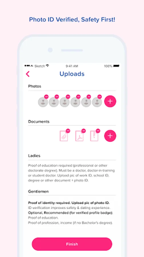 - Sign up with your profile info, pictures and upload photo ID (women must also provide proof of education).