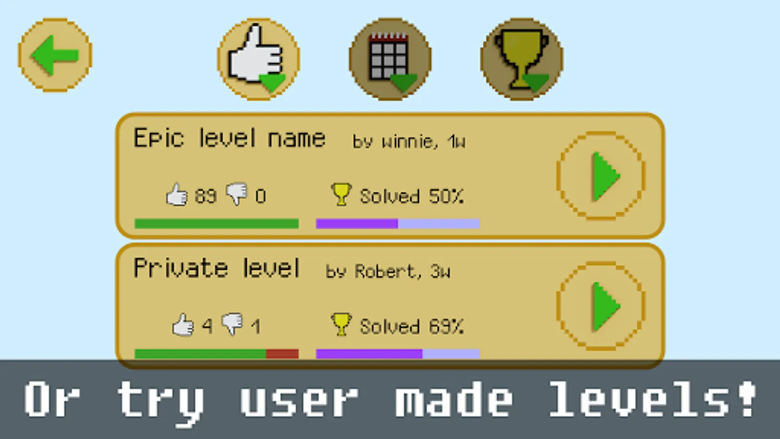 There is an online browser featuring all levels which players have created themselves, so you can play for as long as you want. Pick the highest rated ones or explore the newly submitted section.