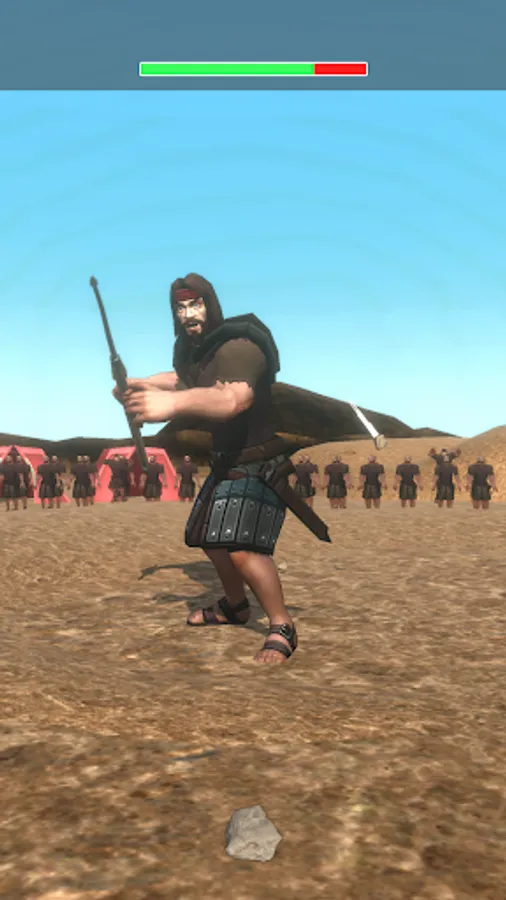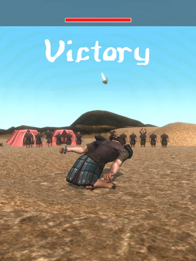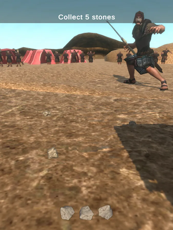 This Augmented Reality app allows you to walk through a portal in the digital realm as you come face to face with Goliath. You need to find 5 stones on the floor by following the instructions on the screen. Once you have collected the stones you then angle your phone (thinking wind, speed and distance) and flick using your finger moving it in a fast motion. Make sure you are holding tight to your phone as you flick a stone at Goliath's head. Once Goliath is hit on the body you will see his health decrease. If you hit his head it is a direct hit and Goliath will fall to the ground and you will have victory.