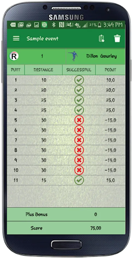 Eleven (11) bonus points are added if all putts in a round are successful.