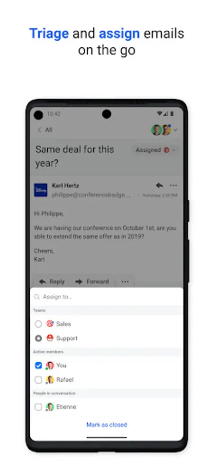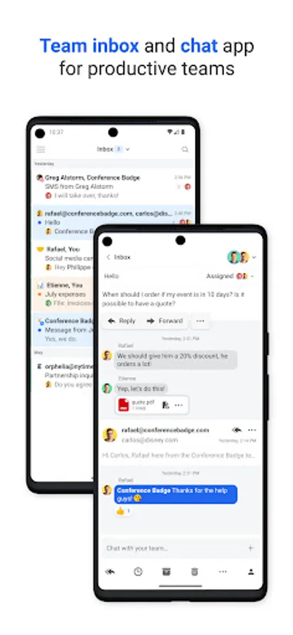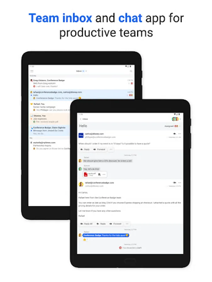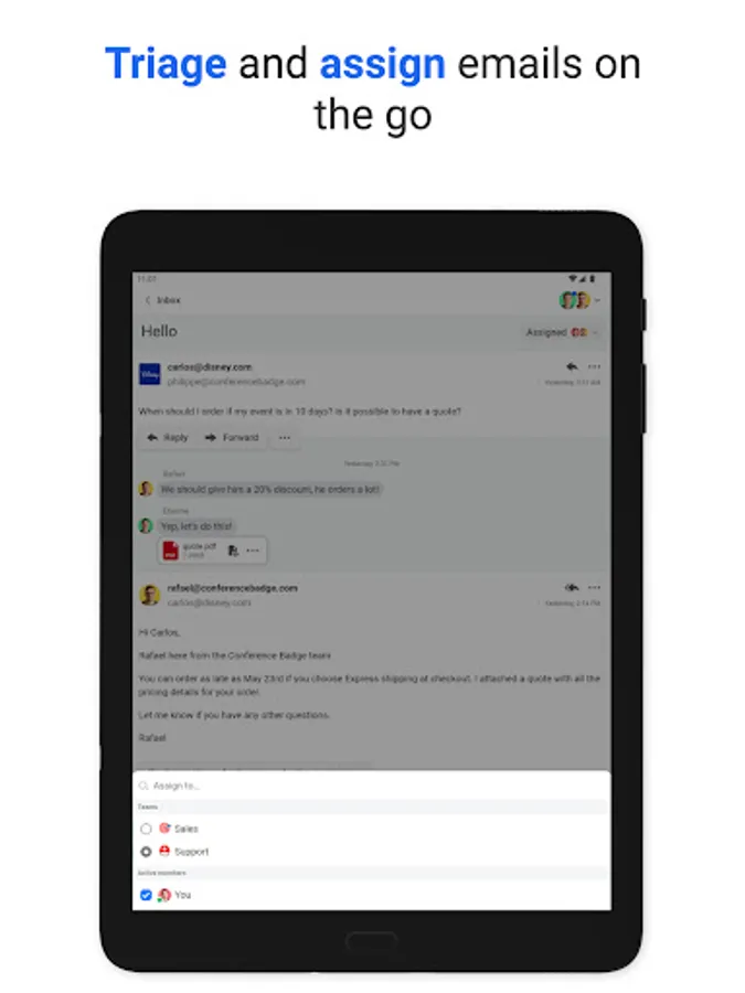 Missive lets teams manage shared inboxes and collaborate around emails. Chat, share attachments and assign tasks right from your inbox. Use shared labels to organize conversations by project or department.