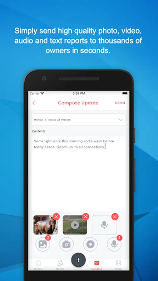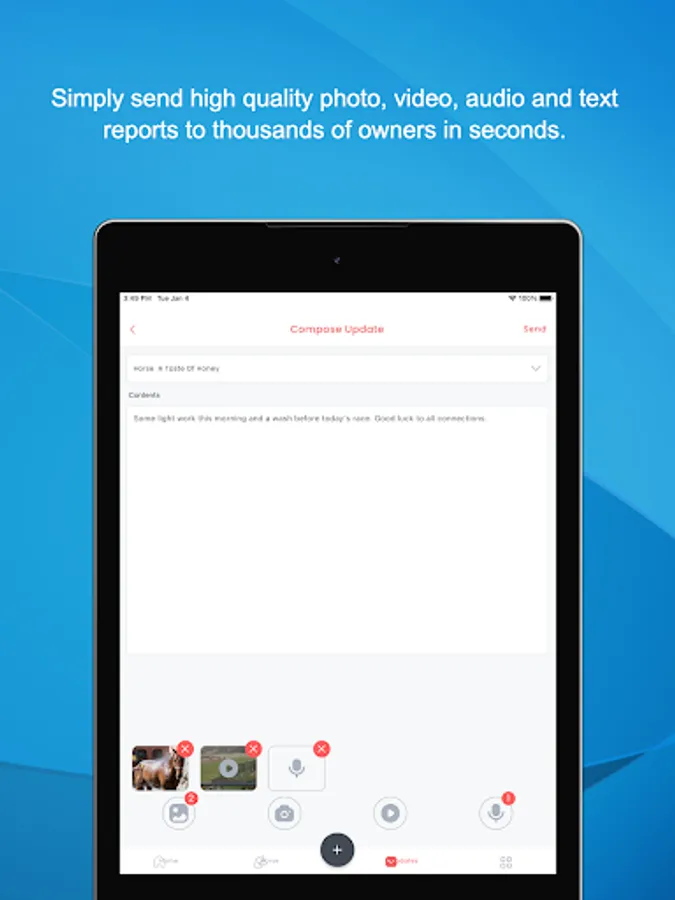 Make your owners feel like they are with you at the track, sales or in the paddock. Direct from the app send video, send audio, send photos or send text reports in seconds. Send them all securely in seconds.