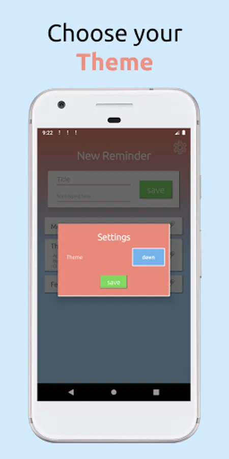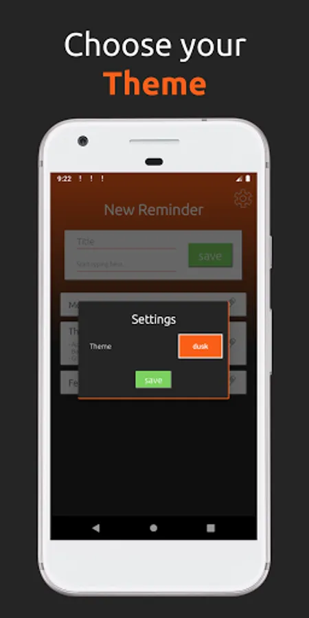 Kind Reminders allows you to change the theme of the app. Currently, there are two themes: “dawn” and “dusk”. Simply navigate to the settings wheel in the upper right corner. Under the “Theme", tap to select the theme you want. Once saved, the changes will take effect the next time Kind Reminders is started.