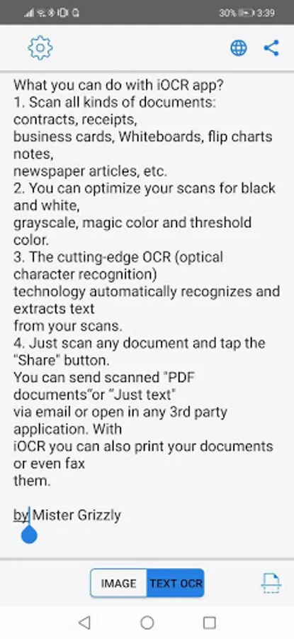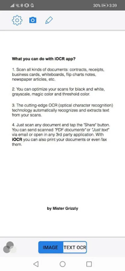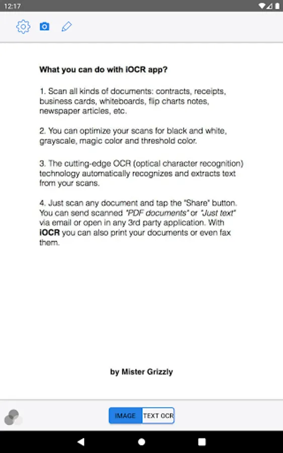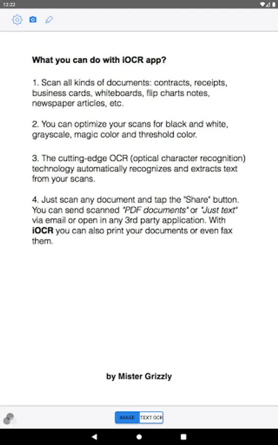 iOCR is a Android application for recognize a text from image. Take an image, or import from Gallery, choose filter, press “Text OCR” button, and get text from image. Also you can edit and share detected text or convert it to PDF document! Easy and fun!