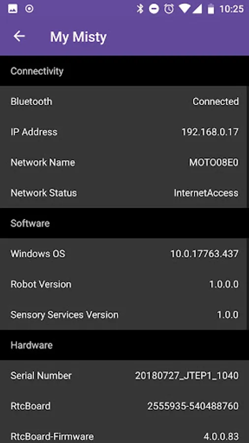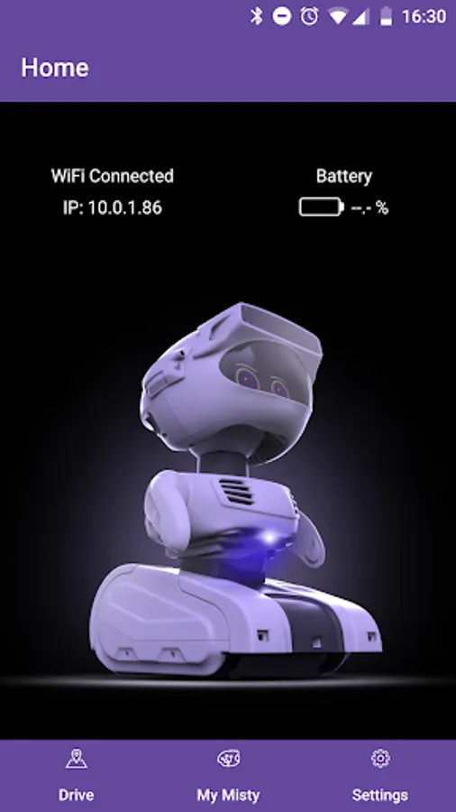 Misty’s Companion App lets you set up Bluetooth and Wi-Fi connections to your robot and drive Misty around her environment. The app also provides a clean interface for getting information about your robot’s battery levels, software versions, and IP address.
