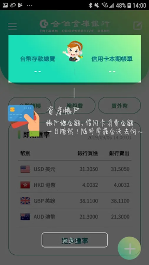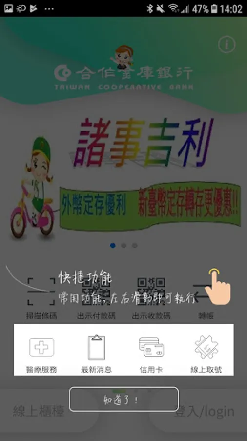 1. Provide the bank’s Taiwan dollar deposit account balance and detailed inquiry, agreed and non-agreed account transfer, payment of various utility fees and taxes, loan inquiry and payment, foreign exchange deposit inquiry and transaction, and inquiry of the bank’s credit card bill And payment, VISA financial card bill inquiry, fund inquiry and transaction, intelligent customer service and online number retrieval and other functions.