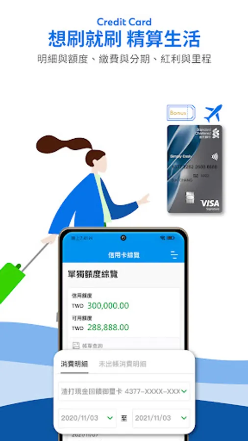 * Easy to inquiry your credit card balance, view statements, transaction details with spending analysis and redeem bonus points in one place.