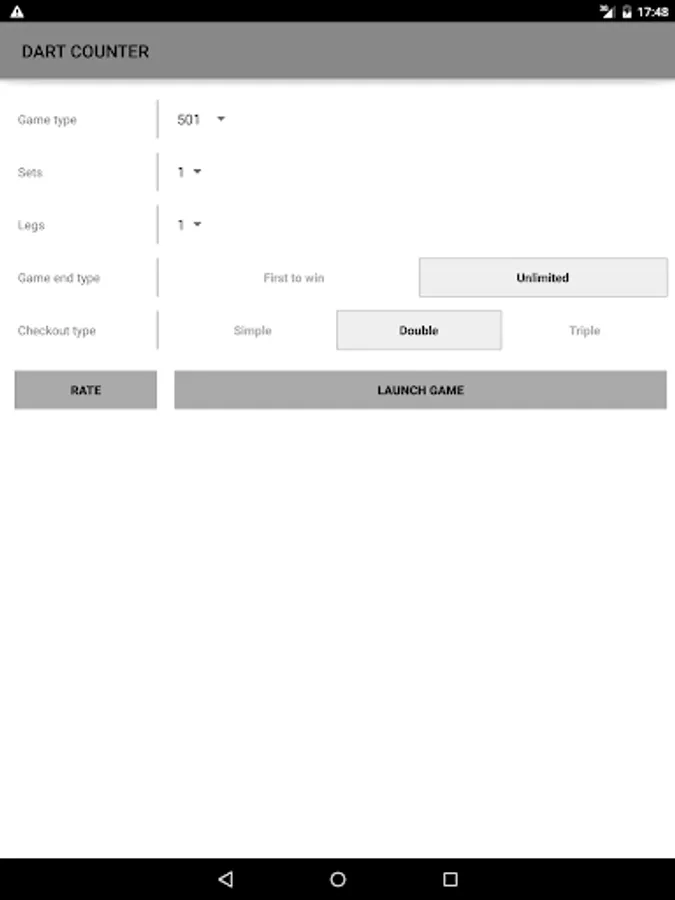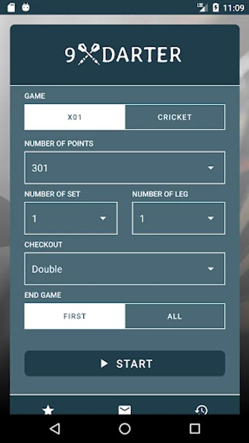 In X01 mode, 9Darter offers advanced options such as dart multiples to finish a leg (All, Single, Double, Triple) and dart suggestions for finishing a leg with a Double. These features help you refine your strategy and improve your skills to become a true X01 expert.