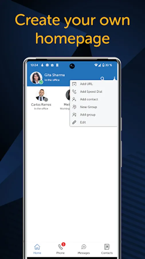 • Access visual voice mail for your office extension and manage messages by preference rather than sequence
