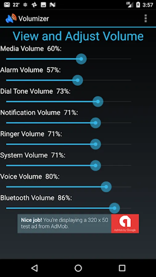 This application will allow you to adjust all of your volume levels from a single location. Audio control for all your volume settings including Bluetooth, Media, Alarm, Dial Tone, Notification, Ringer, System and Voice.