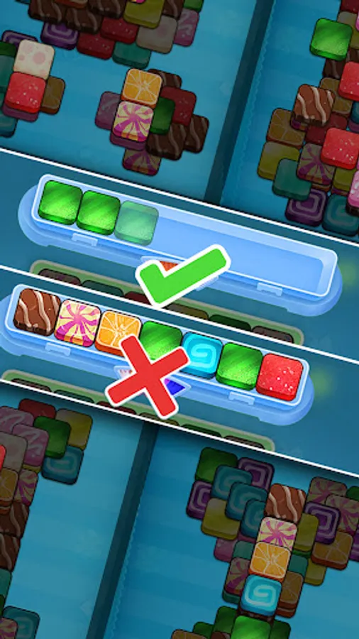 Just tap to place the candy onto the top board. Three same candies will be eliminated. Remove all the candies as fast as possible. You will get high scores if you achieve combos in mania mode. When all candies are eliminated, you win! When there are 7 candies on the top board, you fail!