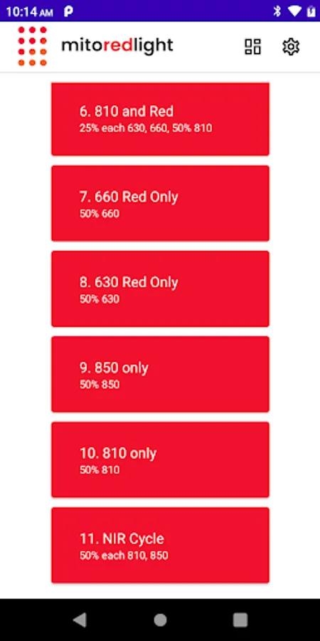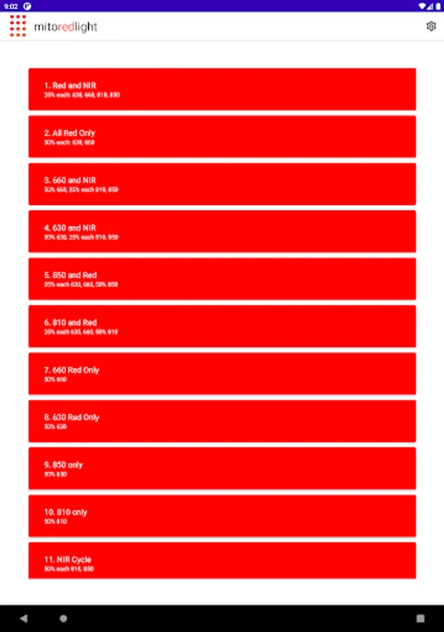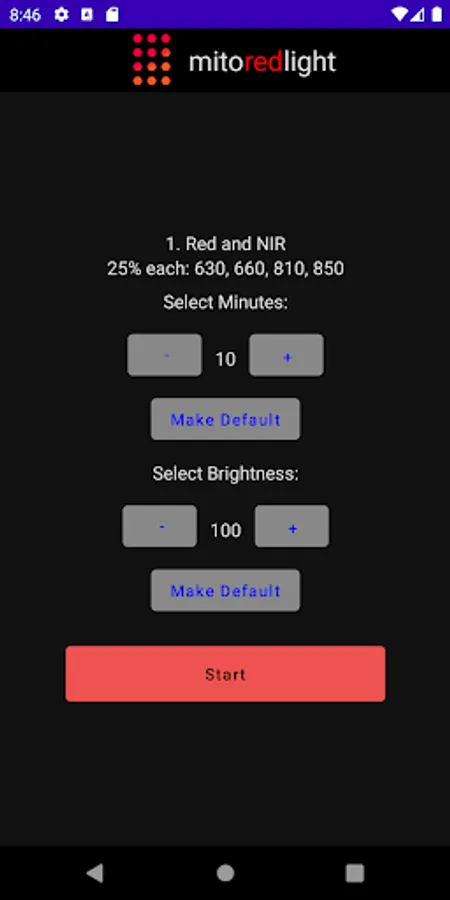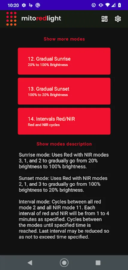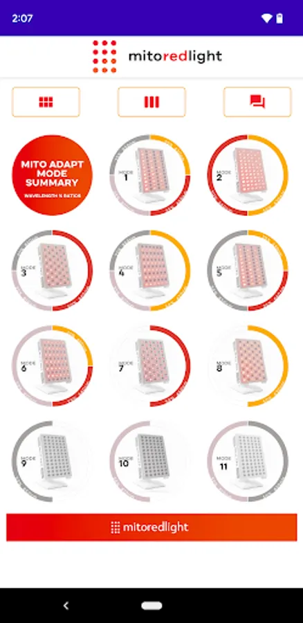 The MitoRedLight app is the remote control for your Mito Red Light Adapt device! Through the app, you connect to your MitoADAPT panel, select the channel, set the time duration, and start your therapy session. Your device will turn on then turn off automatically at the end of the time you selected. Using the app makes it super easy to program your therapy session. Our 100% NIR mode is only available through the app! There are also 3 other modes only available through the app: gradual sunrise, gradual sunset, and Red/NIR intervals.