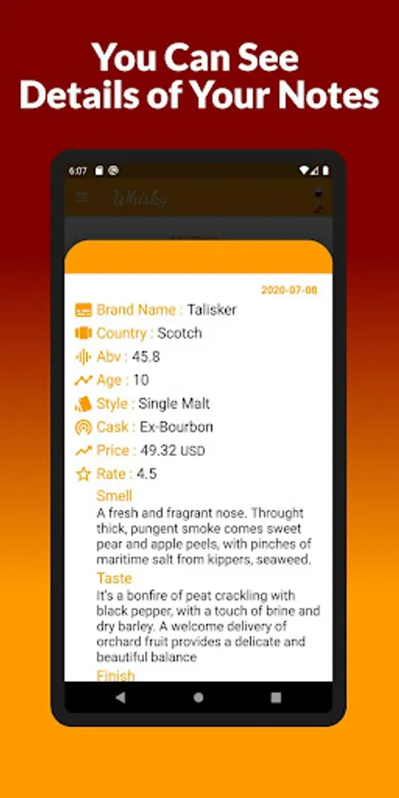 - Brand Name, Country, Age, Abv, Style, Cask, Price with Currency, Smell, Taste, Finish and Review