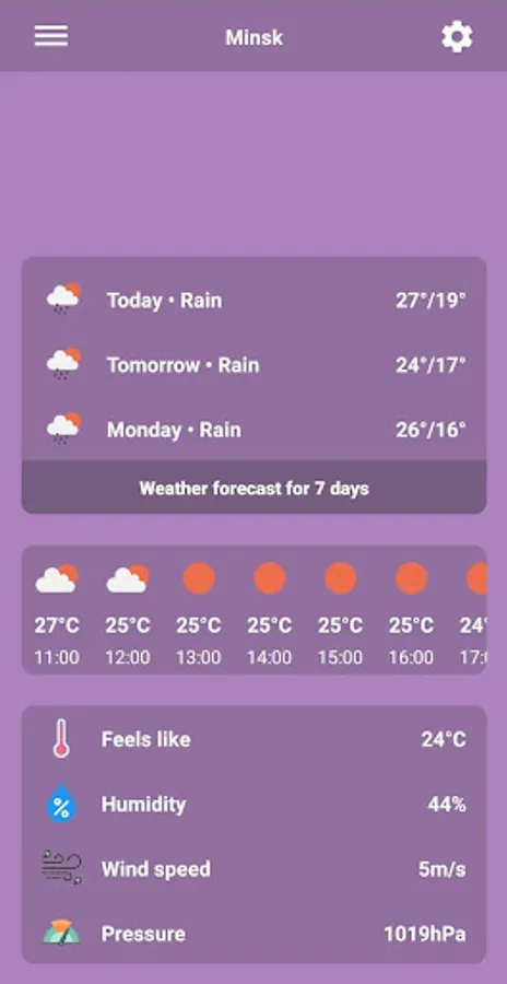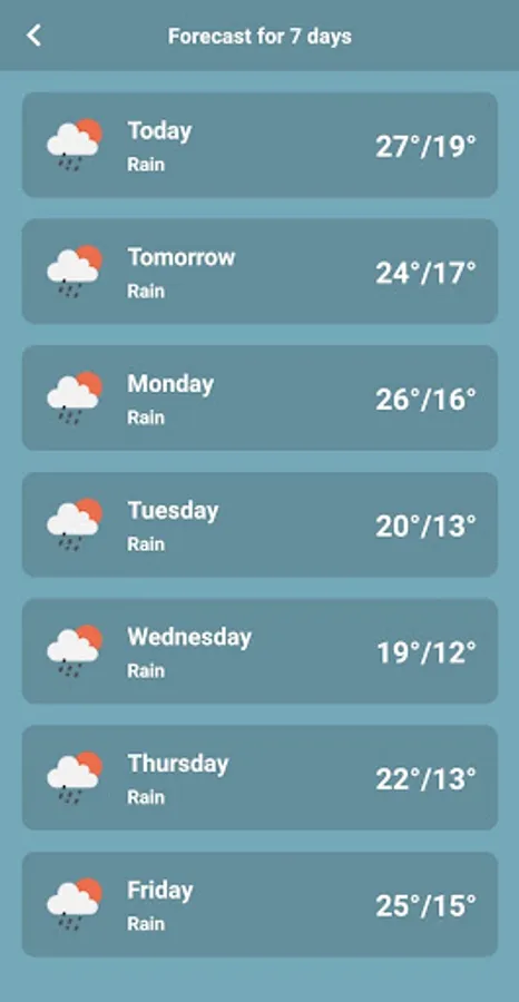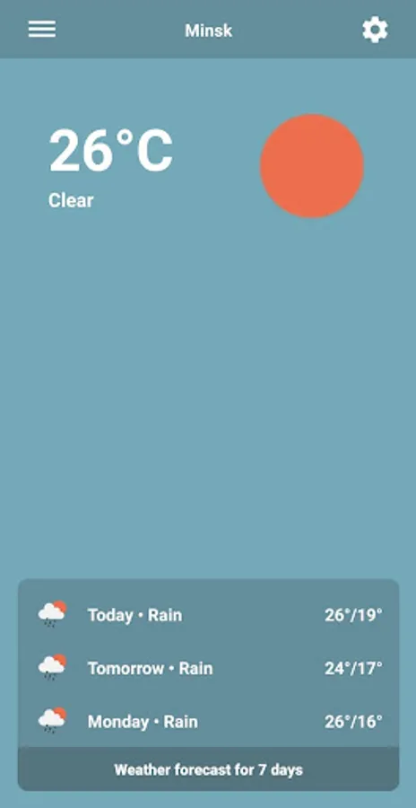 Weather forecast application which affords you current weather data, hourly and daily weather forecast of any place in the world. You can fetch your current location or choose it by yourself. This app hs small size and amazingly easy to use or customise as you like.