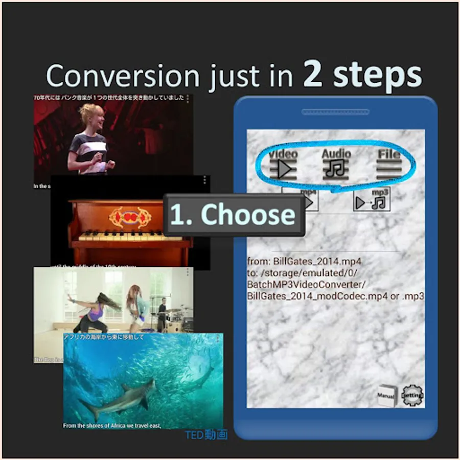 ・convert high resolution (high definition: HD) video files for PC into the ones for smartphones to save storage space or get quick response. (Changing resolution)