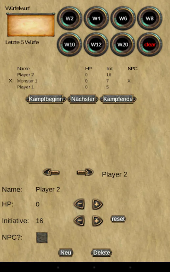 [Open Beta] The app includes a dice generator for W2, W4, W6, W8, W12 and W20 and a table for initiative and HP for players and NPCs.
