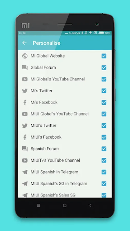 In the app, you will find all MIUI and Mi's (Xiaomi) social networks All of them in a single place, organised by countries and easily identifiable. Besides, you can hide the accounts and sections you don't care about using the "Personalise" section.