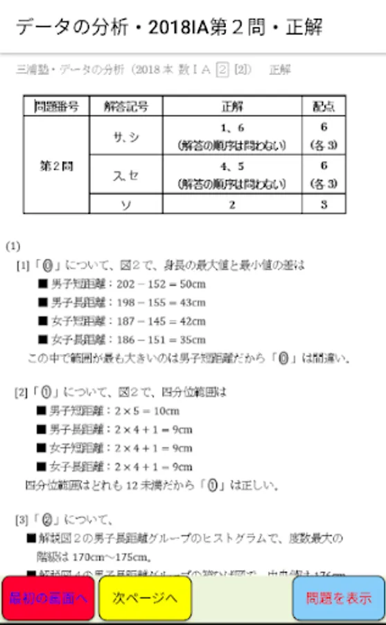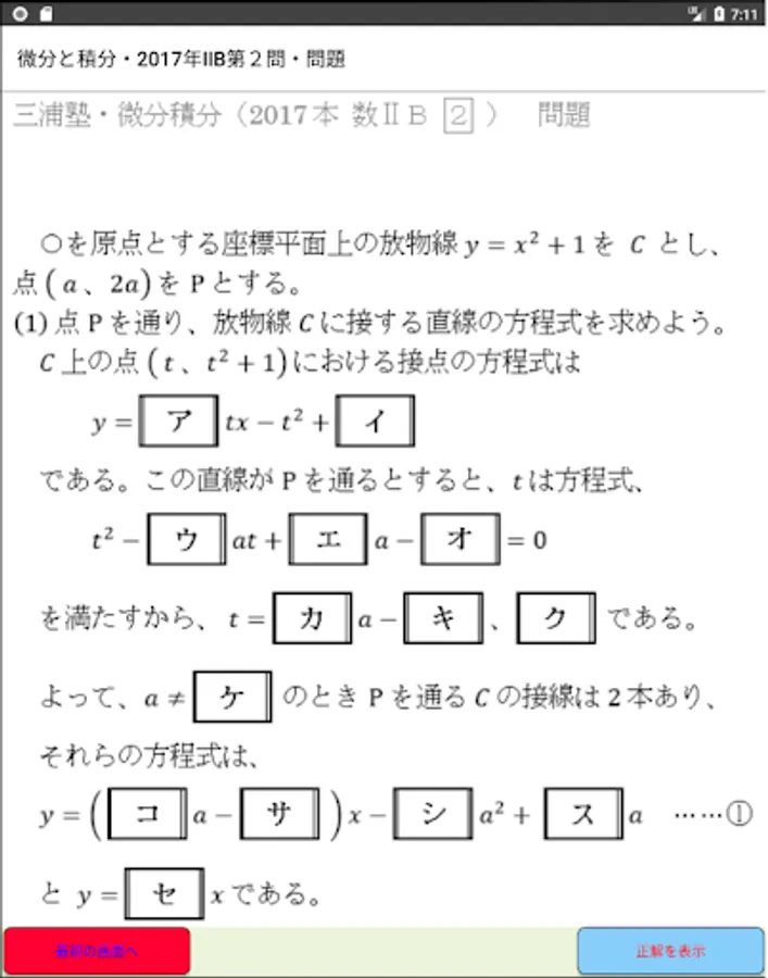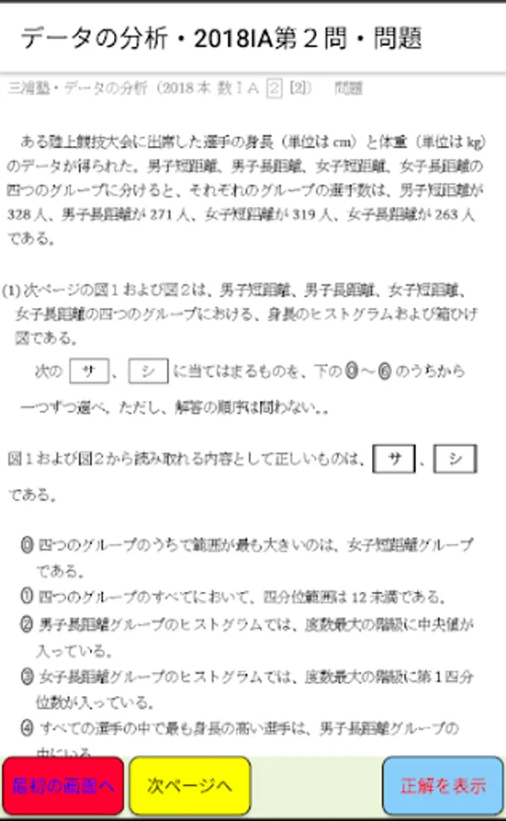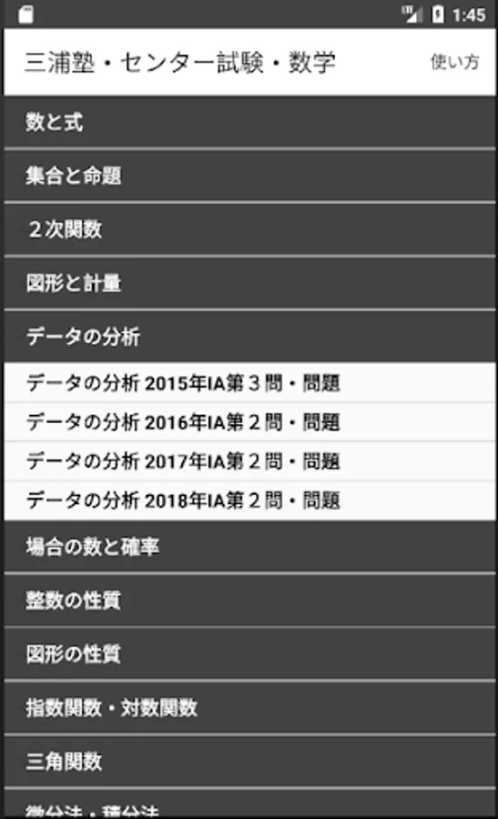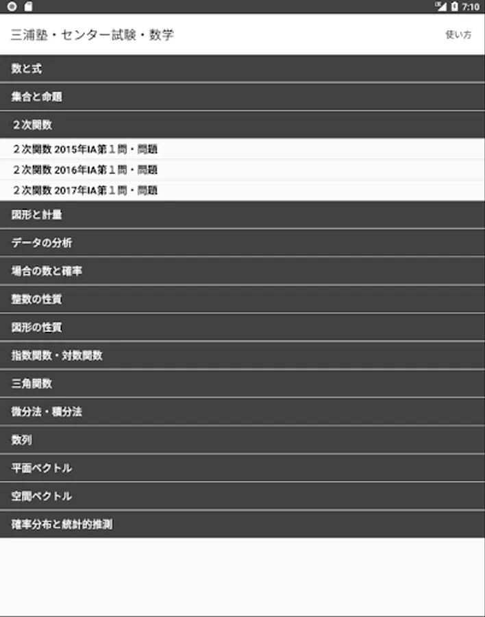 Center exam math problems and detailed correct answers are included. There is a new course for 2015-2019. When you tap the math field that appears when you open the app, items by year of that field appear. Tap any one of them to move to the problem screen. If you tap the "Show Correct" button on the question screen, you will move to the correct screen. Pinch or double-tap the problem screen or the correct answer screen to enlarge or reduce the image.