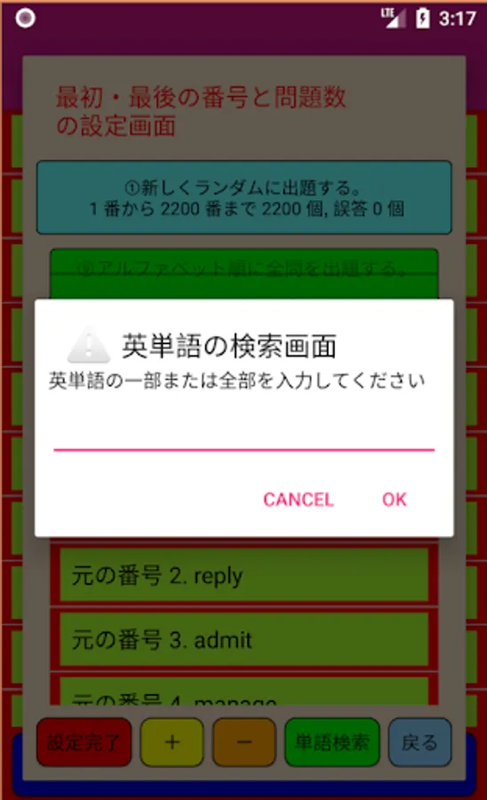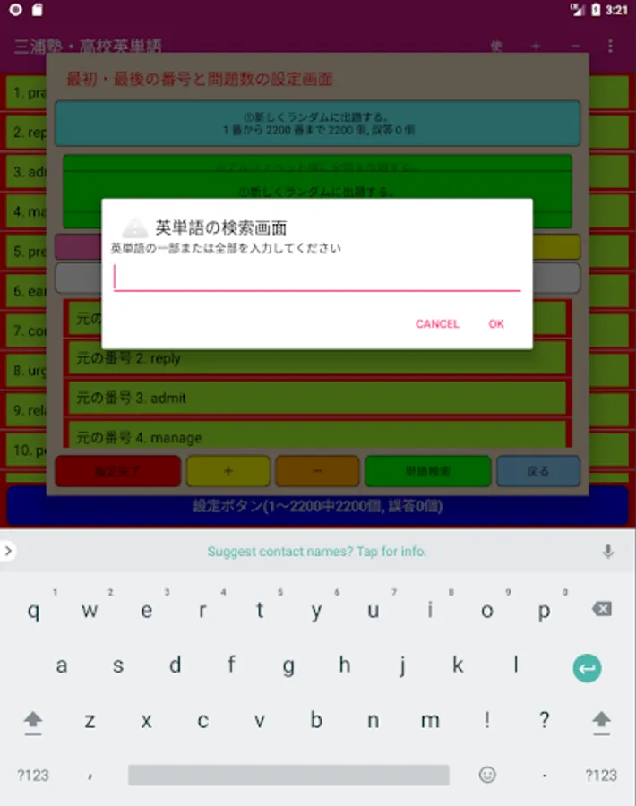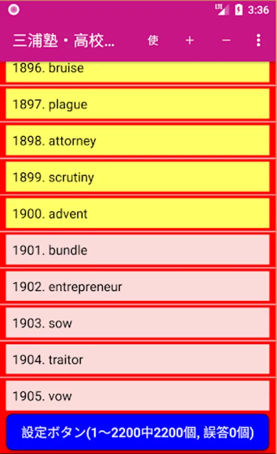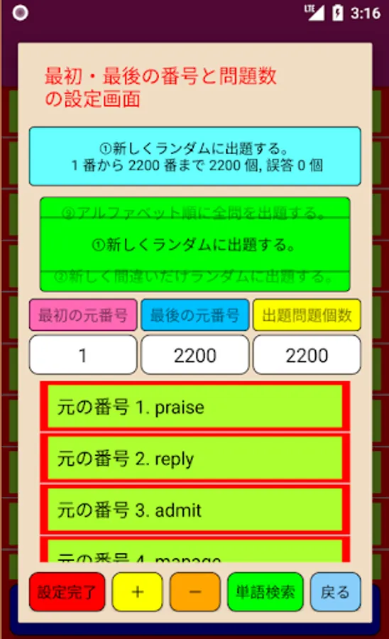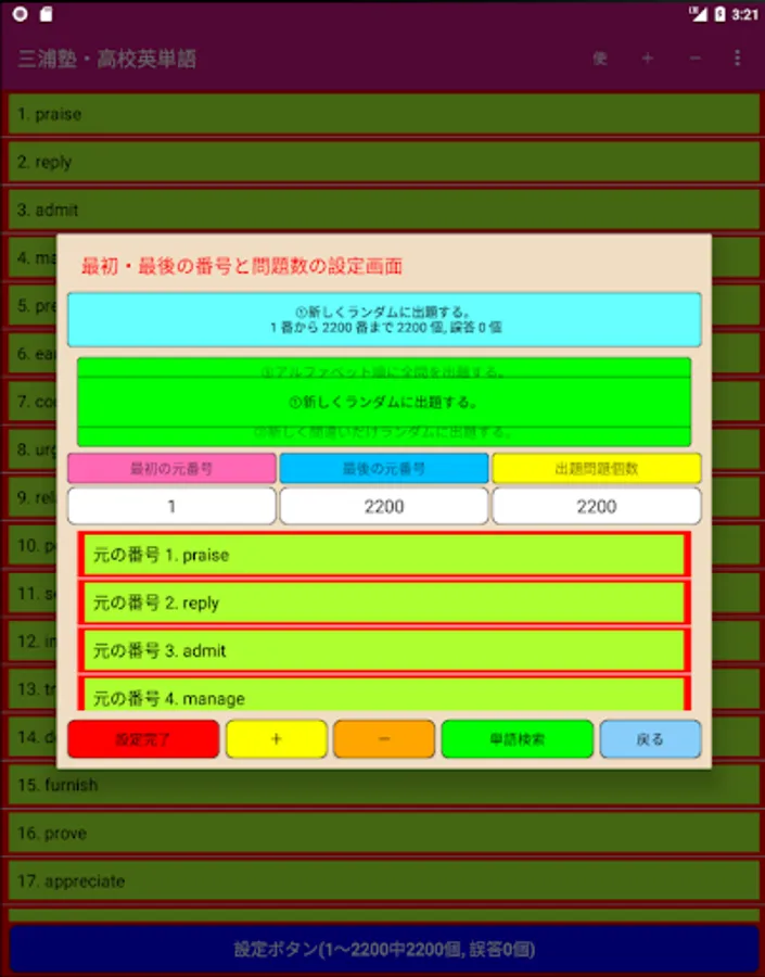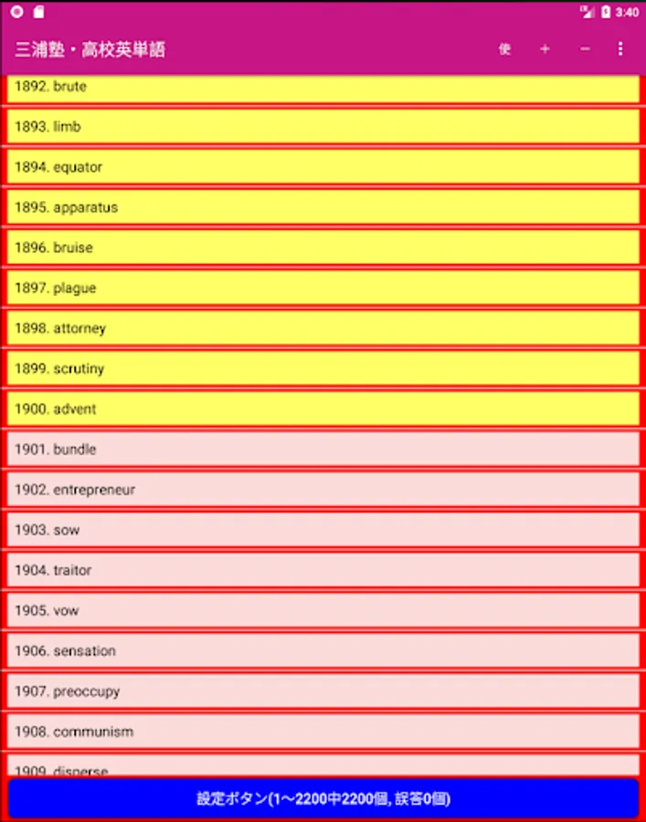 It is an application for memorizing English words for university entrance exams. When you first open the app, the 2,200 English words are arranged in order of appearance in entrance exams. 1.-800. are basic words (green), 801.-1500. are standard words (blue), 1501.-1900. are upper intermediate words (yellow), 1901.-2200. is. If you set the first and last numbers and the number of words you want to remember, they will be instantly displayed randomly. Each single-click on a word alternates between the word and its meaning. Double-click to increase or decrease the number of incorrect answers. The number of incorrect answers is saved even if you close the app. (The first and last numbers to be set are the numbers displayed when you first open this app.)
