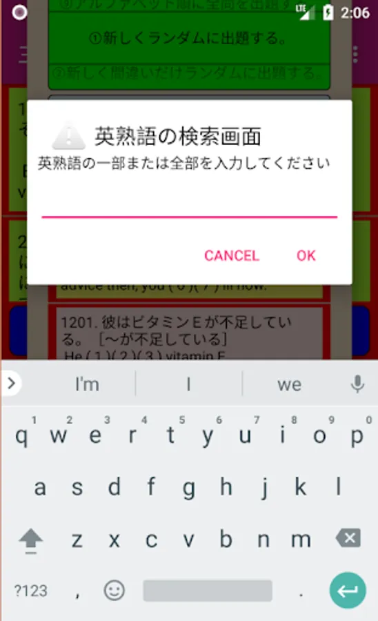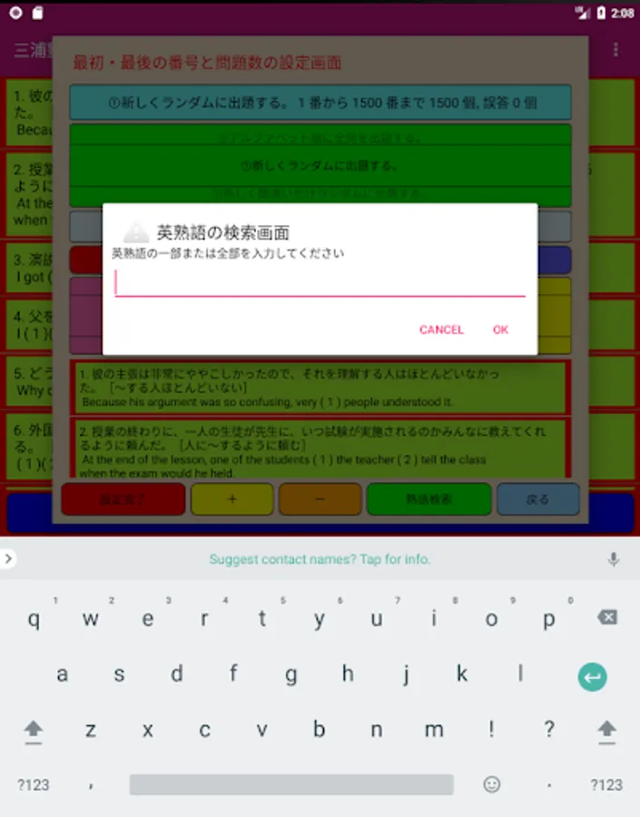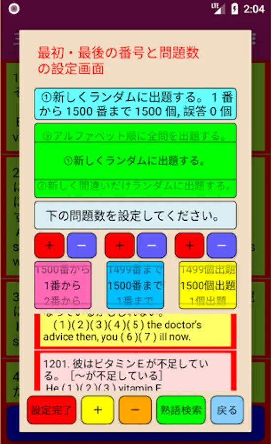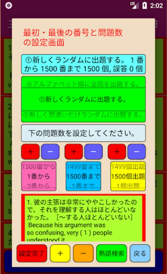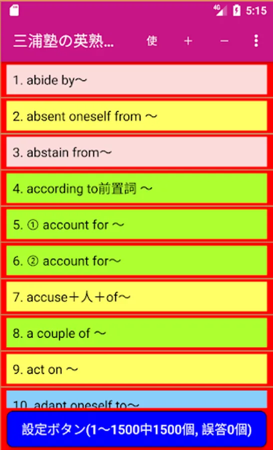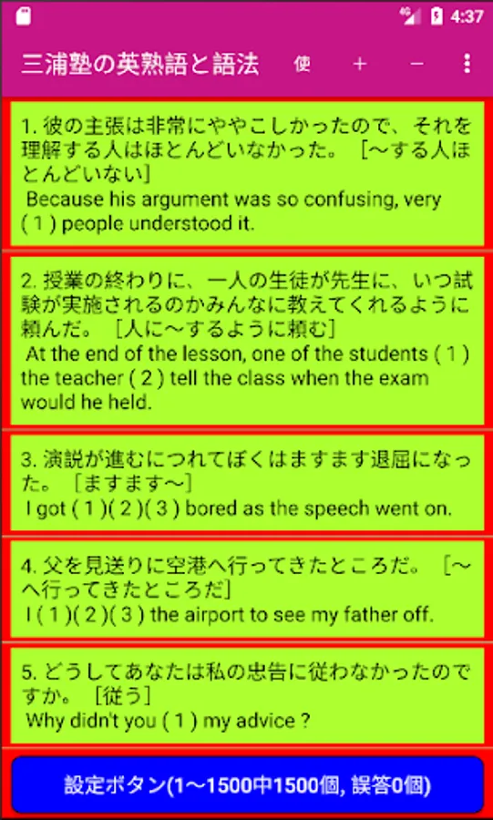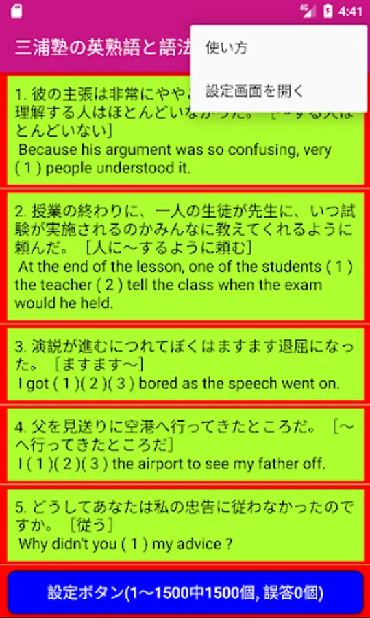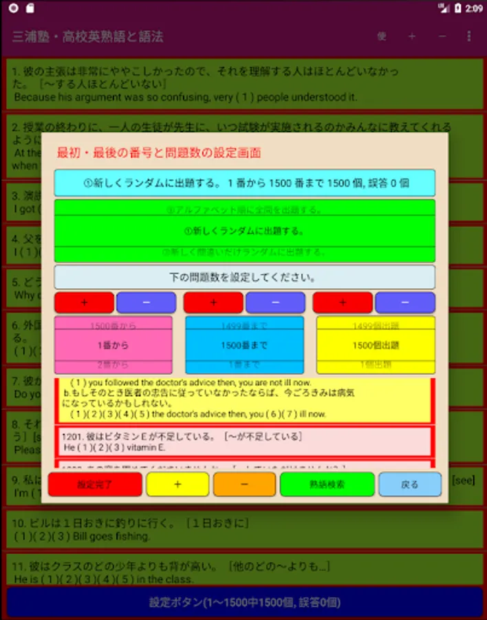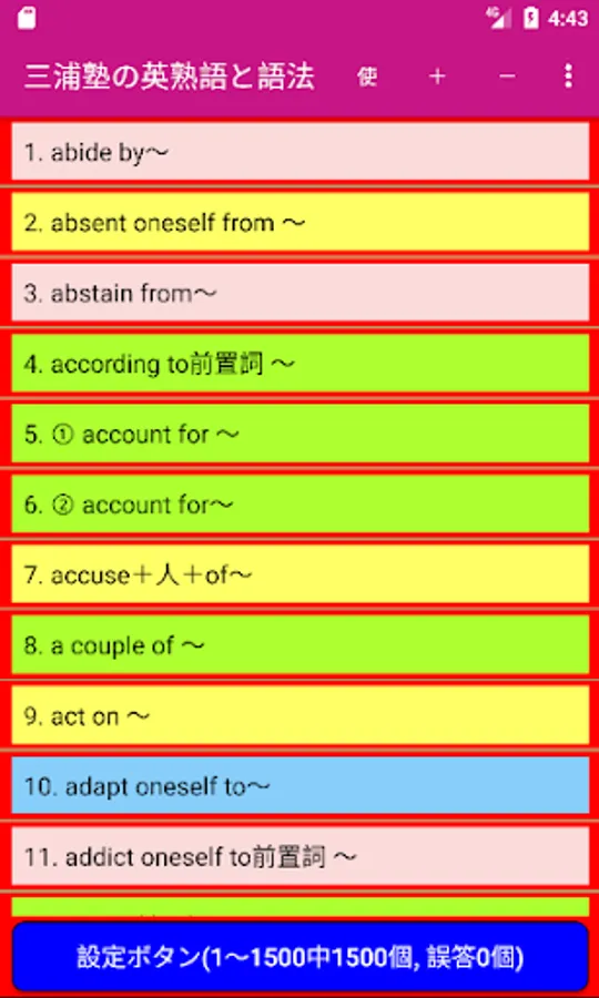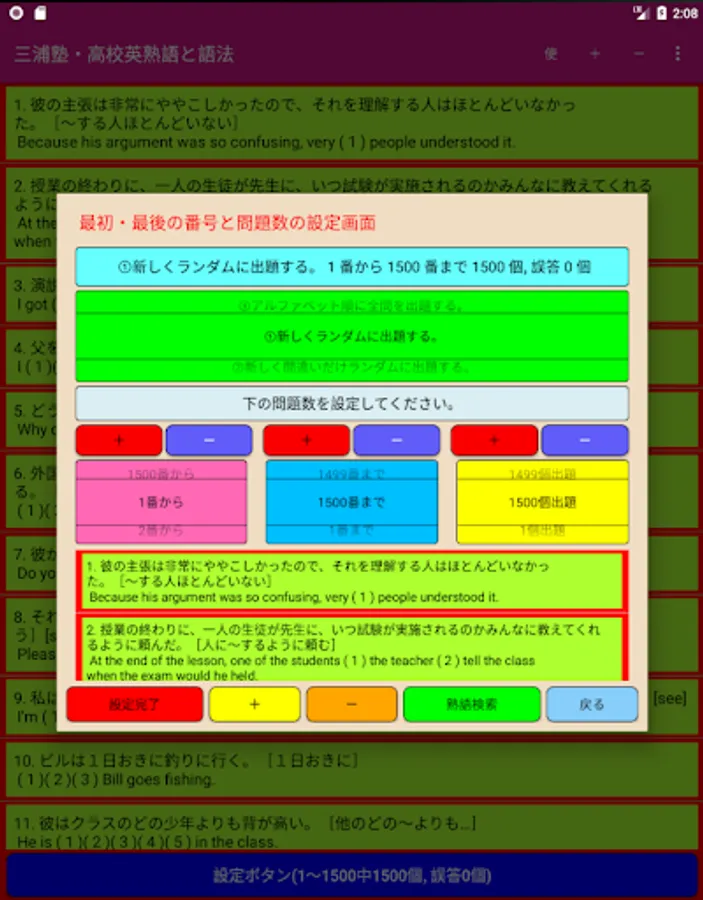 大学入試の英熟語と語法を暗記するのためのアプリです。アプリを開いた最初の表示は、1500個の英熟語・語法が入試によく出る順に並んでいます。1.~400.が基礎レベル(緑色)、401.~800.が標準レベル(青色) 、801.~1200.が標準上位レベル(黄色)、1201.~1500.が合否を決めるレベル(淡桃色)です。覚えたい英熟語・語法の最初と最後の番号と出題個数を設定すれば、瞬時にランダムに問題が表示されます。各項目をシングルクリックするたびに、問題と正解が交互に表示されます。ダブルクリックすると、不正解数を増やしたり減らしたりできます。不正解数は、アプリを閉じても保存されます。(設定する最初の番号・最後の番号は、このアプリを最初に開いたときに表示される番号です。)