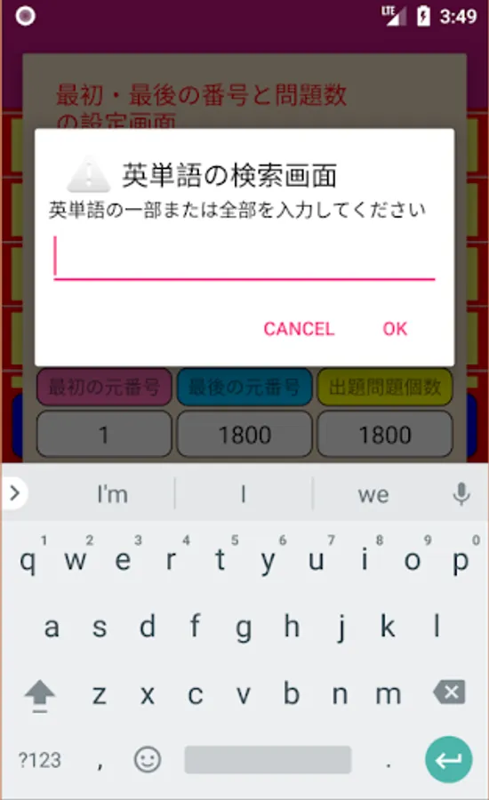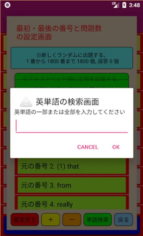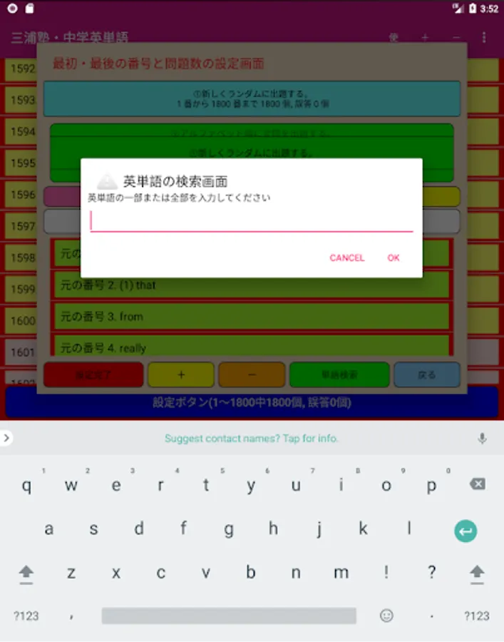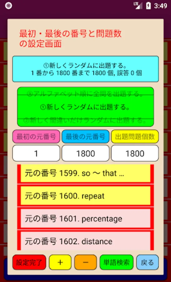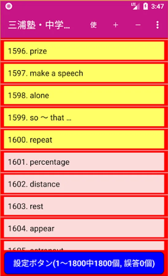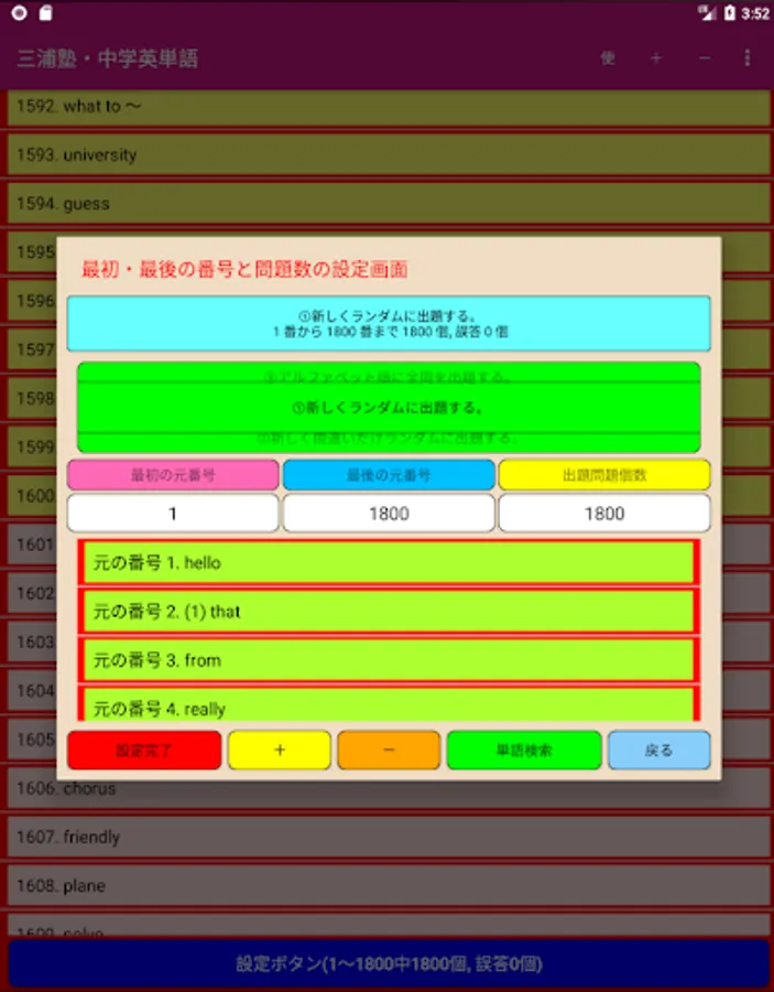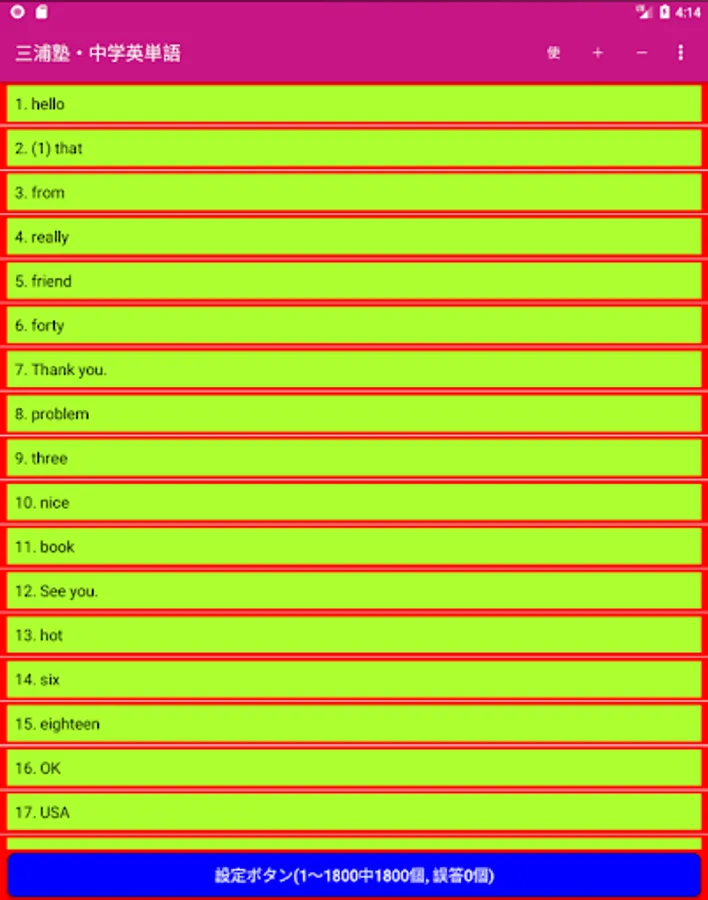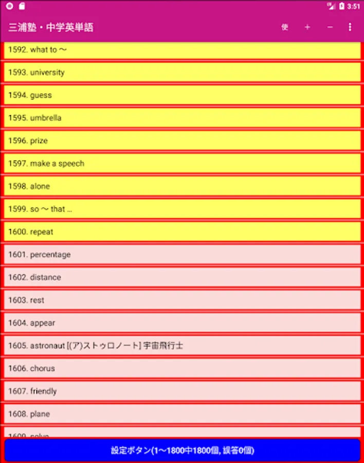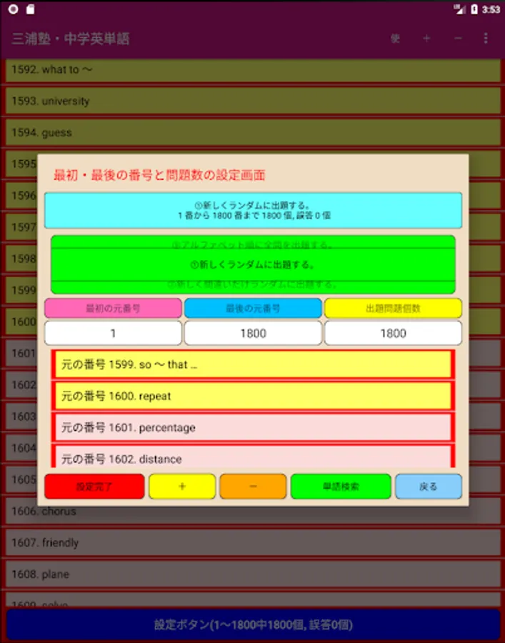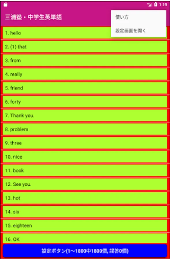 Word of the screen most is first displayed, it has side-by-side in order to learn by grade of junior high school. Words No.1 ~ No. 600 is learned in one year middle (green), words 601 th to 1200 th is learned in 8th years (blue), word 1201 No. ~ 1600 th is learned in ninth grade (yellow), 1601 No. to 1900 number is the word out to the high school entrance examination (pale pink). If the problem space-answer column to a single tap, problem-correct answer will change alternately. When the problem space, double-tap the correct answer column, you can increase or decrease the incorrect number. When you set up a quiz problem, the first number, the last number of questions problem is the problem number that is displayed when you open the app in the first (the original number). The English words is checked also by heart many times, by removing the check If you remember, you can effectively use this app.