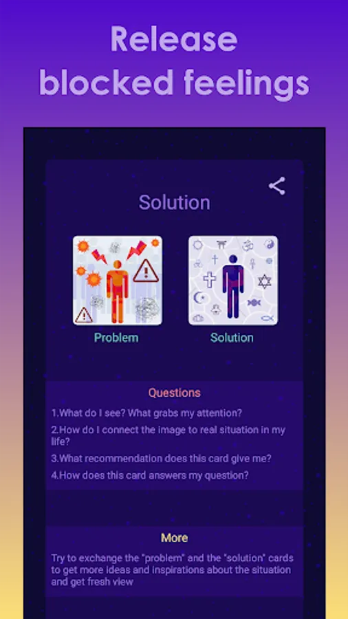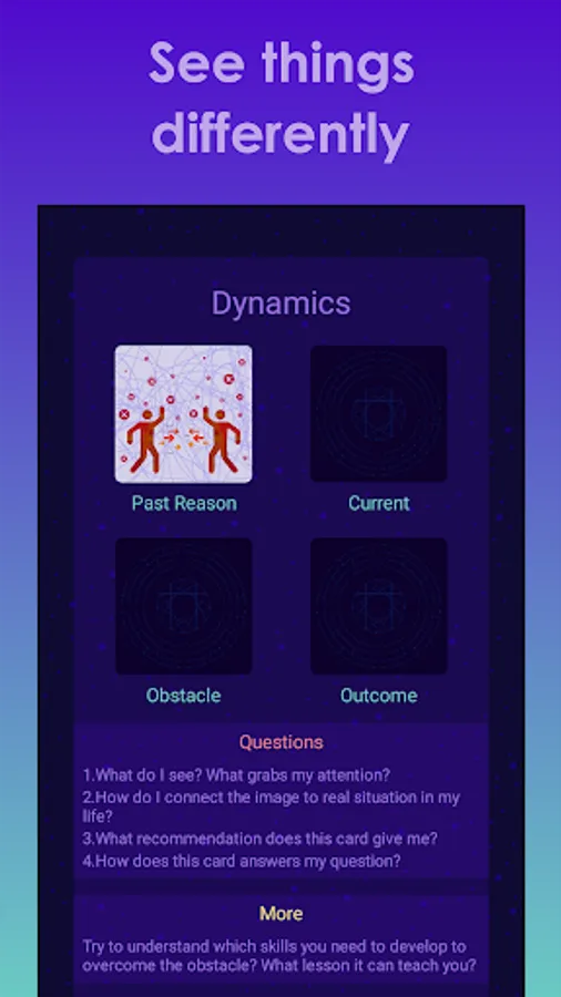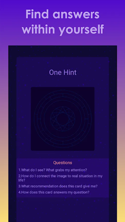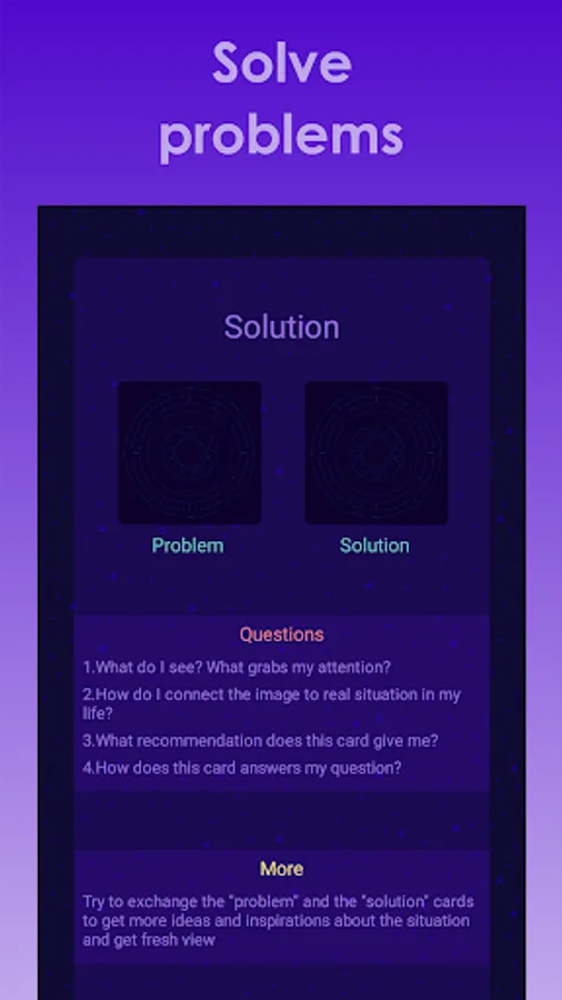 Cards in in this application contain ideas from Tarot cards and oracle cards, but they are not fortune telling cards or playing cards.