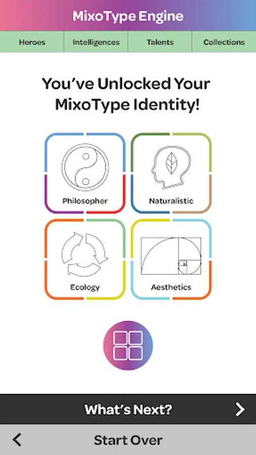 Discover, Analyze, Self-Reflect and Build Your Identity Step-by-Step based on your Heroes, Intelligences, Talents, & Collections. This process produces a four-squared badge called your MixoType, which is the visual representation of your identity. With your MixoType, you get to unlock who you are at the core so that you can build a narrative around that identity. Self-Discovery can take you years, but MIXO: The Discovery App shortcuts that process into a matter of minutes. Now you can spend less time finding yourself and dedicate more time towards building around your true and authentic self.